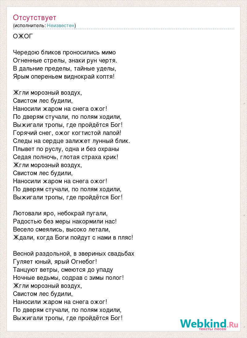 ОЖОГ Чередою бликов проносились мимо Огненные стрелы, знаки рун чертя. В дальние пределы, тайные уделы, Ярым опереньем виднокрай коптя! Жгли морозный воздух, Свистом лес будили, Наносили жаром на снега ожог! По дверям стучали, по полям ходили, Выжигали тропы, где пройдётся Бог! Горячий снег, ожог когтистой лапой! Следы на сердце залижет лунный блик. Плывет по руслу, одна и без охраны Седая полночь, глотая страха крик! Жгли морозный воздух, Свистом лес будили, Наносили жаром на снега ожог! По дверям стучали, по полям ходили, Выжигали тропы, где пройдётся Бог! Лютовали яро, небокрай пугали, Радостью без меры накормили нас! Весело смеялись, высоко летали, Ждали, когда Боги пойдут с нами в пляс! Весной раздольной, в звериных свадьбах Гуляет юный, ярый Огнебог! Танцуют ветры, смеются до упаду Ночные ведьмы, содрав с зимы полог! Жгли морозный воздух, Свистом лес будили, Наносили жаром на снега ожог! По дверям стучали, по полям ходили, Выжигали тропы, где пройдётся Бог!