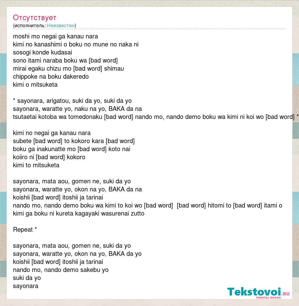 moshi mo negai ga kanau nara kimi no kanashimi o boku no mune no naka ni sosogi konde kudasai sono itami naraba boku wa [bad word] mirai egaku chizu mo [bad word] shimau chippoke na boku dakeredo kimi o mitsuketa * sayonara, arigatou, suki da yo, suki da yo sayonara, waratte yo, naku na yo, BAKA da na tsutaetai kotoba wa tomedonaku [bad word] nando mo, nando demo boku wa kimi ni koi wo [bad word] * kimi no negai ga kanau nara subete [bad word] to kokoro kara [bad word] boku ga inakunatte mo [bad word] koto nai koiiro ni [bad word] kokoro kimi to mitsuketa sayonara, mata aou, gomen ne, suki da yo sayonara, waratte yo, okon na yo, BAKA da na koishii [bad word] itoshii ja tarinai nando mo, nando demo boku wa kimi to koi wo [bad word] [bad word] hitomi to [bad word] itami o kimi ga boku ni kureta kagayaki wasurenai zutto Repeat * sayonara, mata aou, gomen ne, suki da yo sayonara, waratte yo, okon na yo, BAKA da yo koishii [bad word] itoshii ja tarinai nando mo, nando demo sakebu yo suki da yo sayonara