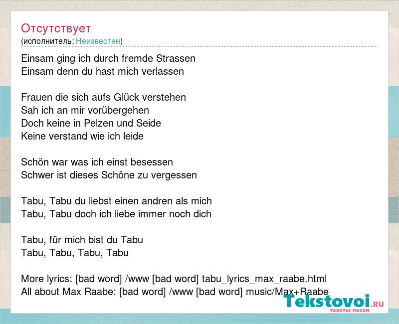 Einsam ging ich durch fremde Strassen Einsam denn du hast mich verlassen Frauen die sich aufs Glück verstehen Sah ich an mir vorübergehen Doch keine in Pelzen und Seide Keine verstand wie ich leide Schön war was ich einst besessen Schwer ist dieses Schöne zu vergessen Tabu, Tabu du liebst einen andren als mich Tabu, Tabu doch ich liebe immer noch dich Tabu, für mich bist du Tabu Tabu, Tabu, Tabu, Tabu More lyrics: [bad word] /www [bad word] tabu_lyrics_max_raabe.html All about Max Raabe: [bad word] /www [bad word] music/Max+Raabe