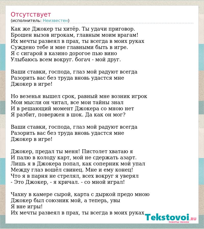 Как же Джокер ты хитёр. Ты удачи приговор. Брошен вызов игрокам, главным моим врагам! Их мечты развеял в прах, ты всегда в моих руках Суждено тебе и мне главными быть в игре. Я с сигарой в казино дорогое пью вино Улыбаюсь всем вокруг. богач - мой друг. Ваши ставки, господа, глаз мой радуют всегда Разорить вас без труда вновь удастся мне Джокер в игре! Но везенья вышел срок, равный мне возник игрок Мои мысли он читал, все мои тайны знал И в решающий момент Джокера со мною нет Я разбит, повержен в шок. Да как он мог? Ваши ставки, господа, глаз мой радуют всегда Разорить вас без труда вновь удастся мне Джокер в игре! Джокер, предал ты меня! Пистолет хватаю я И палю в колоду карт, мой не сдержать азарт. Лишь я в Джокера попал, как соперник мой упал Между глаз вошёл свинец. Мне и ему конец! Что я в парня не стрелял, всех вокруг я уверял - Это Джокер, - я кричал. - со мной играл! Чахну в камере сырой, карта с дыркой предо мною Джокер был союзник мой, а теперь, увы Я вне игры! Их мечты развеял в прах, ты всегда в моих руках