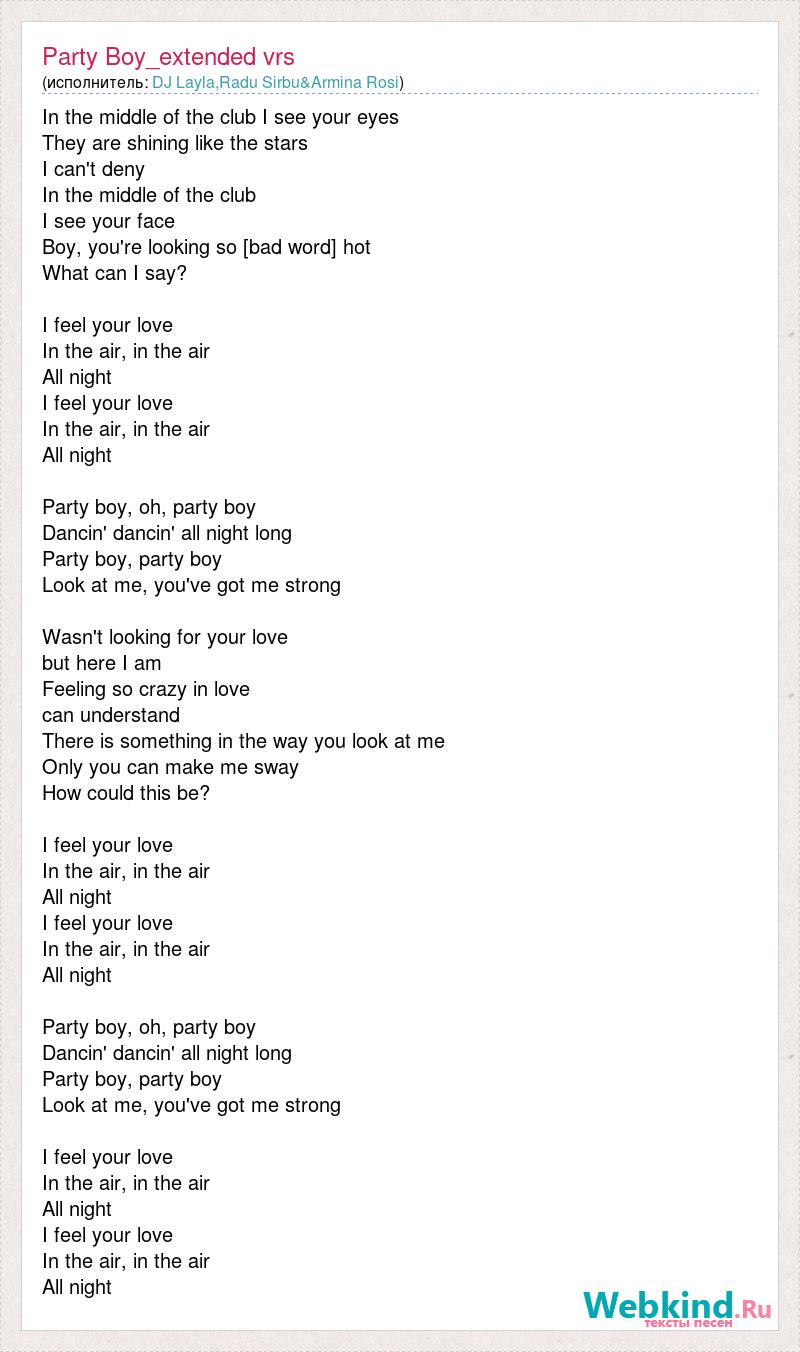 In the middle of the club I see your eyes They are shining like the stars I can't deny In the middle of the club I see your face Boy, you're looking so [bad word] hot What can I say? I feel your love In the air, in the air All night I feel your love In the air, in the air All night Party boy, oh, party boy Dancin' dancin' all night long Party boy, party boy Look at me, you've got me strong Wasn't looking for your love but here I am Feeling so crazy in love can understand There is something in the way you look at me Only you can make me sway How could this be? I feel your love In the air, in the air All night I feel your love In the air, in the air All night Party boy, oh, party boy Dancin' dancin' all night long Party boy, party boy Look at me, you've got me strong I feel your love In the air, in the air All night I feel your love In the air, in the air All night