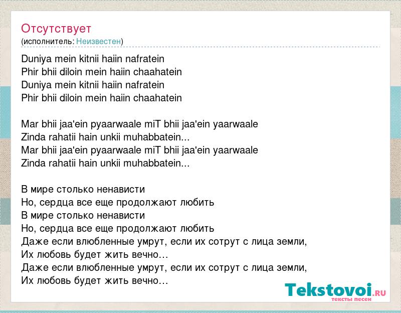 Duniya mein kitnii haiin nafratein Phir bhii diloin mein haiin chaahatein Duniya mein kitnii haiin nafratein Phir bhii diloin mein haiin chaahatein Mar bhii jaa'ein pyaarwaale miT bhii jaa'ein yaarwaale Zinda rahatii hain unkii muhabbatein... Mar bhii jaa'ein pyaarwaale miT bhii jaa'ein yaarwaale Zinda rahatii hain unkii muhabbatein... В мире столько ненависти Но, сердца все еще продолжают любить В мире столько ненависти Но, сердца все еще продолжают любить Даже если влюбленные умрут, если их сотрут с лица земли, Их любовь будет жить вечно… Даже если влюбленные умрут, если их сотрут с лица земли, Их любовь будет жить вечно…