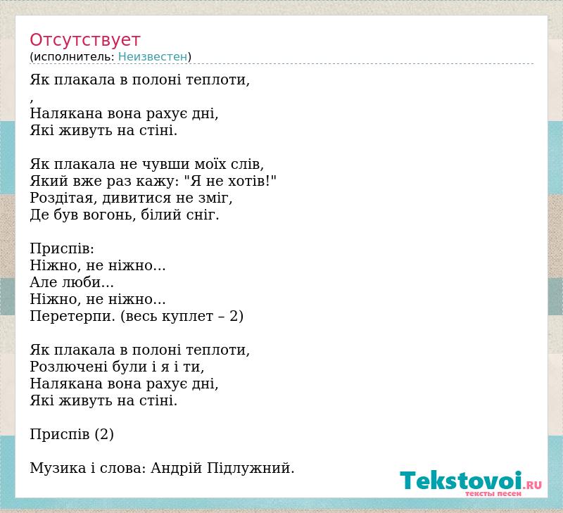 Як плакала в полоні теплоти, , Налякана вона рахує дні, Які живуть на стіні. Як плакала не чувши моїх слів, Який вже раз кажу: "Я не хотів!" Роздітая, дивитися не зміг, Де був вогонь, білий сніг. Приспів: Ніжно, не ніжно... Але люби... Ніжно, не ніжно... Перетерпи. (весь куплет – 2) Як плакала в полоні теплоти, Розлючені були і я і ти, Налякана вона рахує дні, Які живуть на стіні. Приспів (2) Музика і слова: Андрій Підлужний.