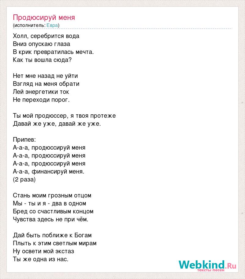 Холл, серебрится вода Вниз опускаю глаза В крик превратилась мечта. Как ты вошла сюда? Нет мне назад не уйти Взгляд на меня обрати Лей энергетики ток Не переходи порог. Ты мой продюссер, я твоя протеже Давай же уже, давай же уже. Припев: А-а-а, продюссируй меня А-а-а, продюссируй меня А-а-а, продюссируй меня А-а-а, финансируй меня. (2 раза) Стань моим грозным отцом Мы - ты и я - два в одном Бред со счастливым концом Чувства здесь не при чём. Дай быть поближе к Богам Плыть к этим светлым мирам Ну освети мой экстаз Ты же одна из нас.