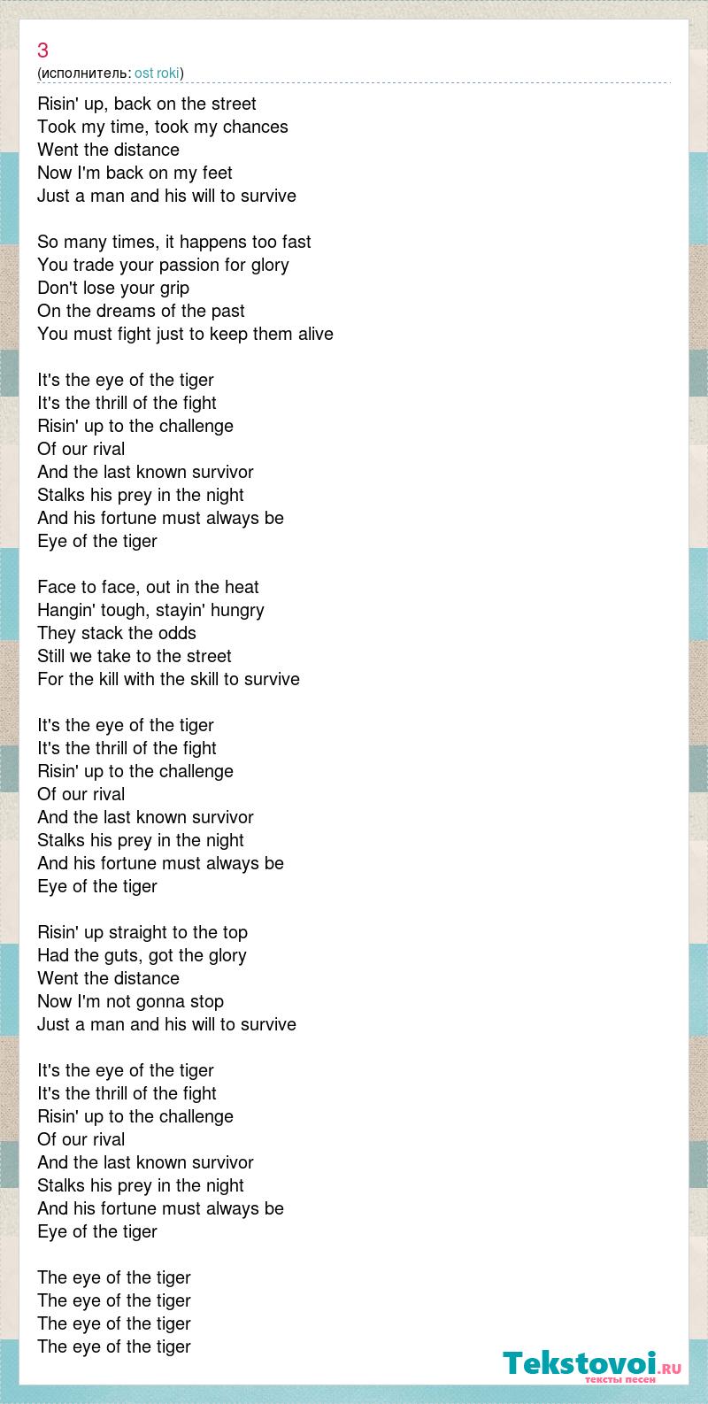 Risin' up, back on the street Took my time, took my chances Went the distance Now I'm back on my feet Just a man and his will to survive So many times, it happens too fast You trade your passion for glory Don't lose your grip On the dreams of the past You must fight just to keep them alive It's the eye of the tiger It's the thrill of the fight Risin' up to the challenge Of our rival And the last known survivor Stalks his prey in the night And his fortune must always be Eye of the tiger Face to face, out in the heat Hangin' tough, stayin' hungry They stack the odds Still we take to the street For the kill with the skill to survive It's the eye of the tiger It's the thrill of the fight Risin' up to the challenge Of our rival And the last known survivor Stalks his prey in the night And his fortune must always be Eye of the tiger Risin' up straight to the top Had the guts, got the glory Went the distance Now I'm not gonna stop Just a man and his will to survive It's the eye of the tiger It's the thrill of the fight Risin' up to the challenge Of our rival And the last known survivor Stalks his prey in the night And his fortune must always be Eye of the tiger The eye of the tiger The eye of the tiger The eye of the tiger The eye of the tiger