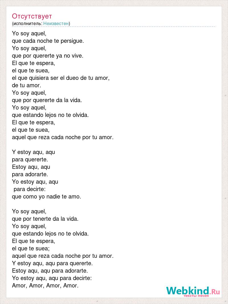 Yo soy aquel, que cada noche te persigue. Yo soy aquel, que por quererte ya no vive. El que te espera, el que te suea, el que quisiera ser el dueo de tu amor, de tu amor. Yo soy aquel, que por quererte da la vida. Yo soy aquel, que estando lejos no te olvida. El que te espera, el que te suea, aquel que reza cada noche por tu amor. Y estoy aqu, aqu para quererte. Estoy aqu, aqu para adorarte. Yo estoy aqu, aqu para decirte: [bad word] yo nadie te amo. Yo soy aquel, que por tenerte da la vida. Yo soy aquel, que estando lejos no te olvida. El que te espera, el que te suea; aquel que reza cada noche por tu amor. Y estoy aqu, aqu para quererte. Estoy aqu, aqu para adorarte. Yo estoy aqu, aqu para decirte: Amor, Amor, Amor, Amor.