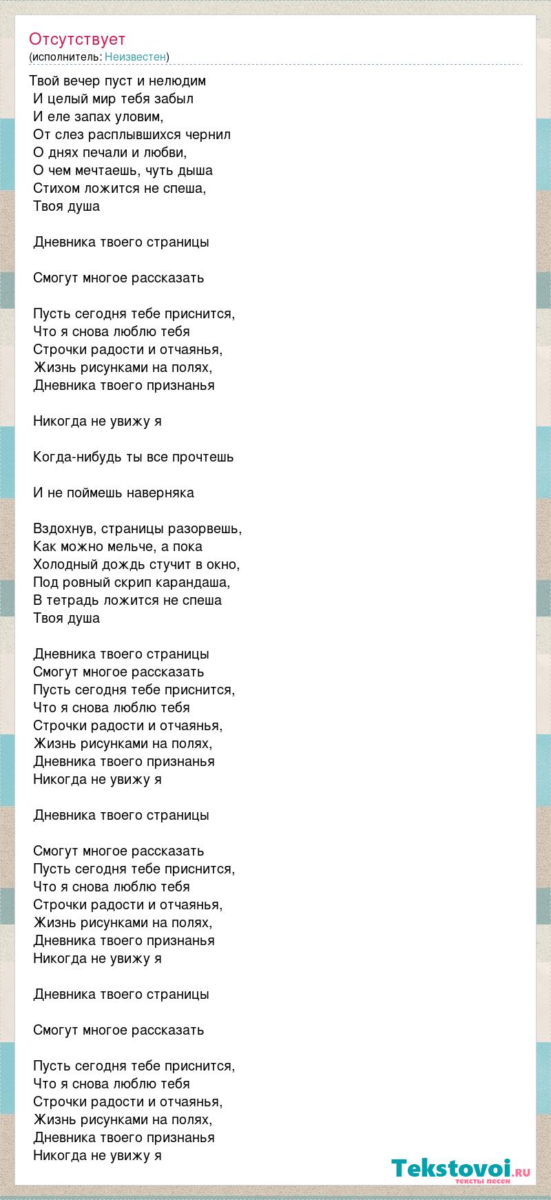 Твой вечер пуст и нелюдим И целый мир тебя забыл И еле запах уловим, От слез расплывшихся чернил О днях печали и любви, О чем мечтаешь, чуть дыша Стихом ложится не спеша, Твоя душа Дневника твоего страницы Смогут многое рассказать Пусть сегодня тебе приснится, Что я снова люблю тебя Строчки радости и отчаянья, Жизнь рисунками на полях, Дневника твоего признанья Никогда не увижу я Когда-нибудь ты все прочтешь И не поймешь наверняка Вздохнув, страницы разорвешь, Как можно мельче, а пока Холодный дождь стучит в окно, Под ровный скрип карандаша, В тетрадь ложится не спеша Твоя душа Дневника твоего страницы Смогут многое рассказать Пусть сегодня тебе приснится, Что я снова люблю тебя Строчки радости и отчаянья, Жизнь рисунками на полях, Дневника твоего признанья Никогда не увижу я Дневника твоего страницы Смогут многое рассказать Пусть сегодня тебе приснится, Что я снова люблю тебя Строчки радости и отчаянья, Жизнь рисунками на полях, Дневника твоего признанья Никогда не увижу я Дневника твоего страницы Смогут многое рассказать Пусть сегодня тебе приснится, Что я снова люблю тебя Строчки радости и отчаянья, Жизнь рисунками на полях, Дневника твоего признанья Никогда не увижу я
