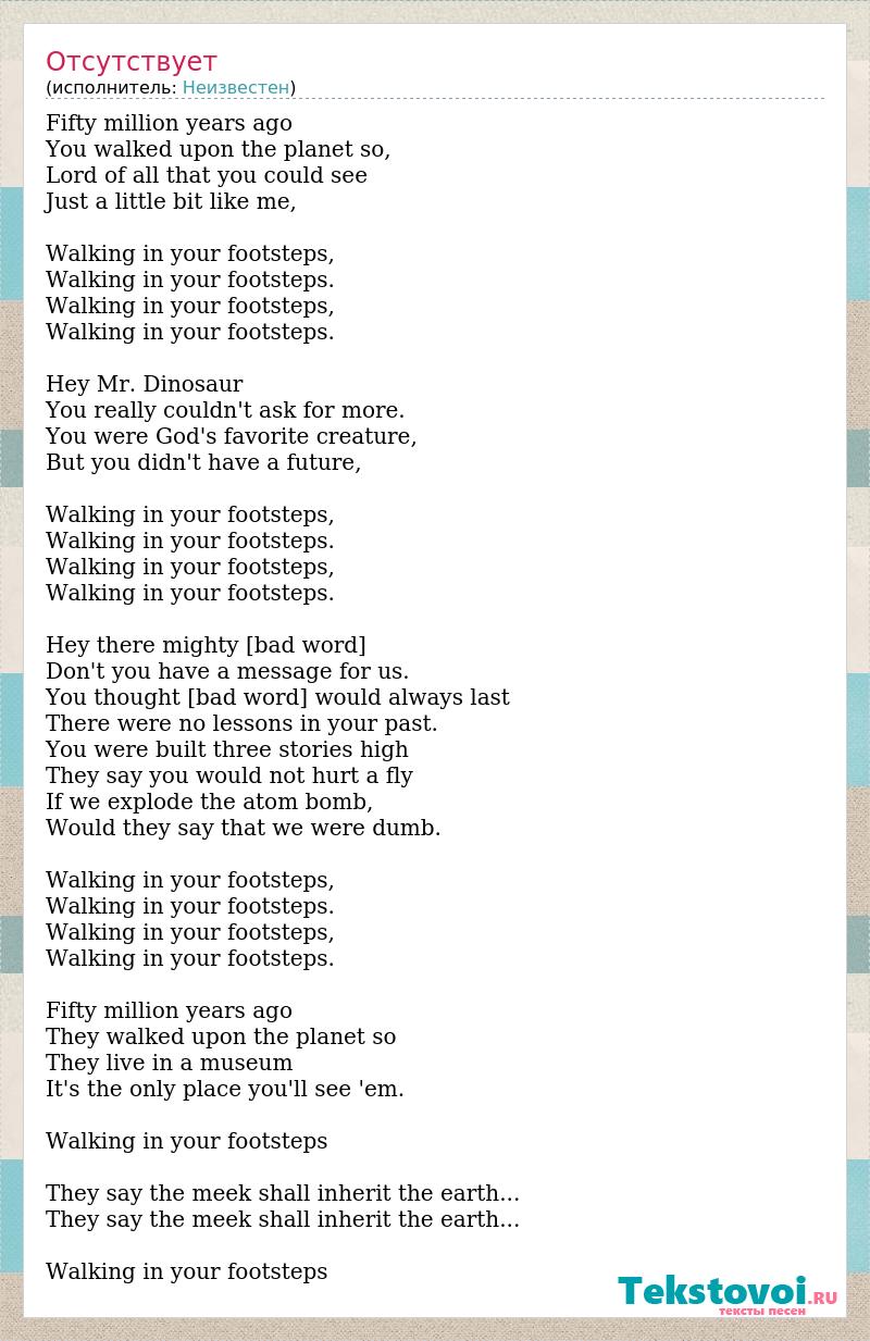 Fifty million years ago You walked upon the planet so, Lord of all that you could see Just a little bit like me, Walking in your footsteps, Walking in your footsteps. Walking in your footsteps, Walking in your footsteps. Hey Mr. Dinosaur You really couldn't ask for more. You were God's favorite creature, But you didn't have a future, Walking in your footsteps, Walking in your footsteps. Walking in your footsteps, Walking in your footsteps. Hey there mighty [bad word] Don't you have a message for us. You thought [bad word] would always last There were no lessons in your past. You were built three stories high They say you would not hurt a fly If we explode the atom bomb, Would they say that we were dumb. Walking in your footsteps, Walking in your footsteps. Walking in your footsteps, Walking in your footsteps. Fifty million years ago They walked upon the planet so They live in a museum It's the only place you'll see 'em. Walking in your footsteps They say the meek shall inherit the earth... They say the meek shall inherit the earth... Walking in your footsteps