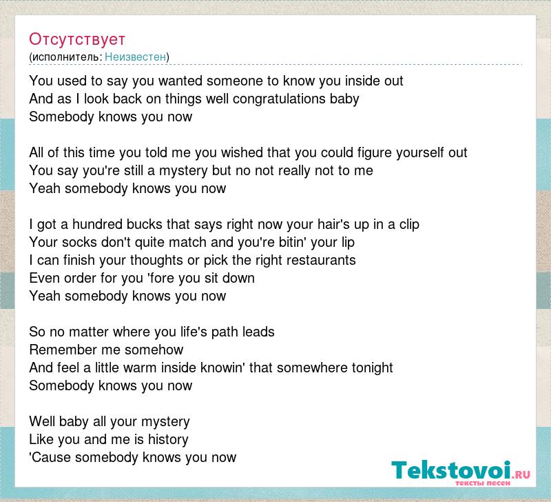 You used to say you wanted someone to know you inside out And as I look back on things well congratulations baby Somebody knows you now All of this time you told me you wished that you could figure yourself out You say you're still a mystery but no not really not to me Yeah somebody knows you now I got a hundred bucks that says right now your hair's up in a clip Your socks don't quite match and you're bitin' your lip I can finish your thoughts or pick the right restaurants Even order for you 'fore you sit down Yeah somebody knows you now So no matter where you life's path leads Remember me somehow And feel a little warm inside knowin' that somewhere tonight Somebody knows you now Well baby all your mystery Like you and me is history 'Cause somebody knows you now