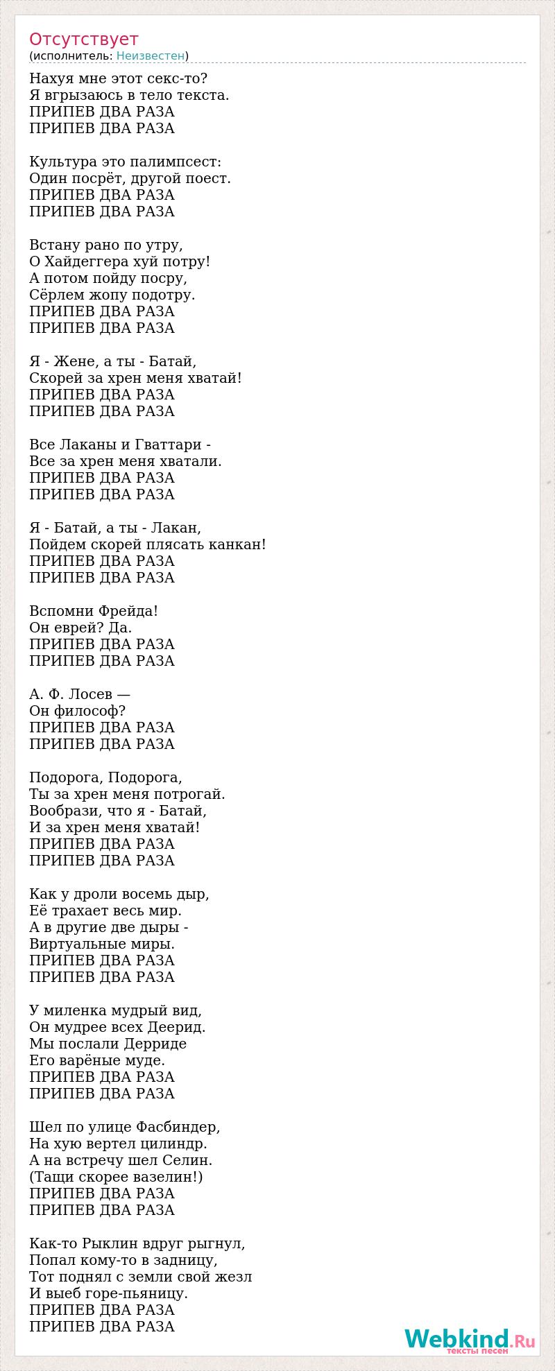 Нахуя мне этот секс-то? Я вгрызаюсь в тело текста. ПРИПЕВ ДВА РАЗА ПРИПЕВ ДВА РАЗА Культура это палимпсест: Один посрёт, другой поест. ПРИПЕВ ДВА РАЗА ПРИПЕВ ДВА РАЗА Встану рано по утру, О Хайдеггера хуй потру! А потом пойду посру, Сёрлем жопу подотру. ПРИПЕВ ДВА РАЗА ПРИПЕВ ДВА РАЗА Я - Жене, а ты - Батай, Скорей за хрен меня хватай! ПРИПЕВ ДВА РАЗА ПРИПЕВ ДВА РАЗА Все Лаканы и Гваттари - Все за хрен меня хватали. ПРИПЕВ ДВА РАЗА ПРИПЕВ ДВА РАЗА Я - Батай, а ты - Лакан, Пойдем скорей плясать канкан! ПРИПЕВ ДВА РАЗА ПРИПЕВ ДВА РАЗА Вспомни Фрейда! Он еврей? Да. ПРИПЕВ ДВА РАЗА ПРИПЕВ ДВА РАЗА А. Ф. Лосев — Он философ? ПРИПЕВ ДВА РАЗА ПРИПЕВ ДВА РАЗА Подорога, Подорога, Ты за хрен меня потрогай. Вообрази, что я - Батай, И за хрен меня хватай! ПРИПЕВ ДВА РАЗА ПРИПЕВ ДВА РАЗА Как у дроли восемь дыр, Её трахает весь мир. А в другие две дыры - Виртуальные миры. ПРИПЕВ ДВА РАЗА ПРИПЕВ ДВА РАЗА У миленка мудрый вид, Он мудрее всех Деерид. Мы послали Дерриде Его варёные муде. ПРИПЕВ ДВА РАЗА ПРИПЕВ ДВА РАЗА Шел по улице Фасбиндер, На хую вертел цилиндр. А на встречу шел Селин. (Тащи скорее вазелин!) ПРИПЕВ ДВА РАЗА ПРИПЕВ ДВА РАЗА Как-то Рыклин вдруг рыгнул, Попал кому-то в задницу, Тот поднял с земли свой жезл И выеб горе-пьяницу. ПРИПЕВ ДВА РАЗА ПРИПЕВ ДВА РАЗА