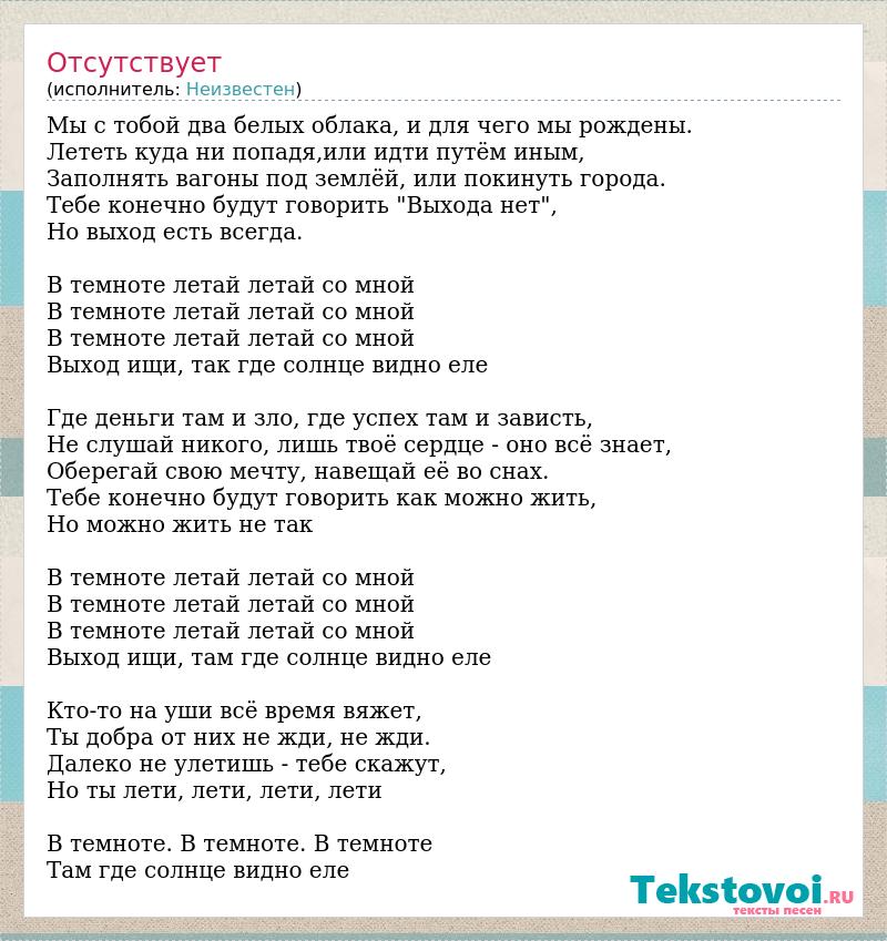 Мы с тобой два белых облака, и для чего мы рождены. Лететь куда ни попадя,или идти путём иным, Заполнять вагоны под землёй, или покинуть города. Тебе конечно будут говорить "Выхода нет", Но выход есть всегда. В темноте летай летай со мной В темноте летай летай со мной В темноте летай летай со мной Выход ищи, так где солнце видно еле Где деньги там и зло, где успех там и зависть, Не слушай никого, лишь твоё сердце - оно всё знает, Оберегай свою мечту, навещай её во снах. Тебе конечно будут говорить как можно жить, Но можно жить не так В темноте летай летай со мной В темноте летай летай со мной В темноте летай летай со мной Выход ищи, там где солнце видно еле Кто-то на уши всё время вяжет, Ты добра от них не жди, не жди. Далеко не улетишь - тебе скажут, Но ты лети, лети, лети, лети В темноте. В темноте. В темноте Там где солнце видно еле