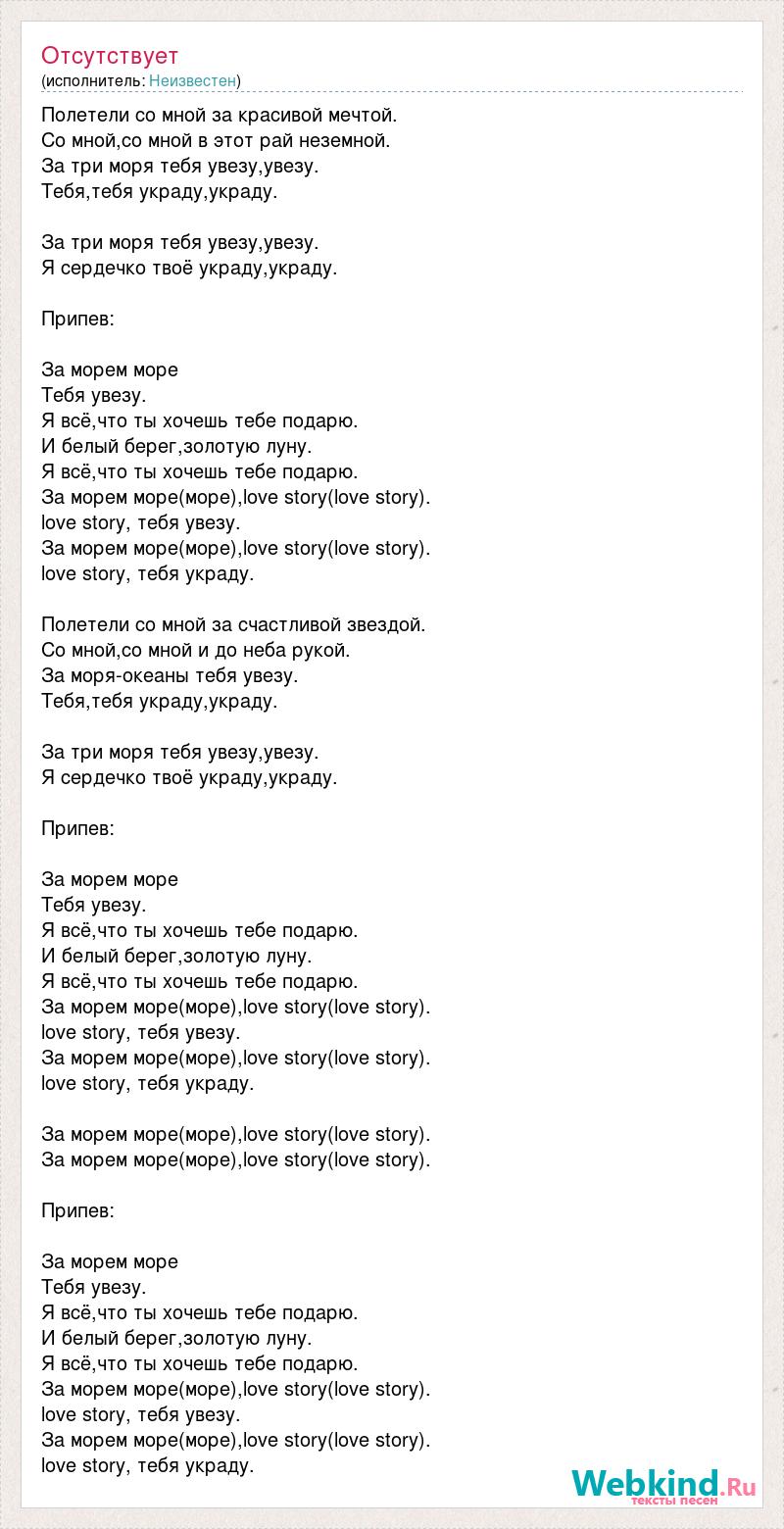 Полетели со мной за красивой мечтой. Со мной,со мной в этот рай неземной. За три моря тебя увезу,увезу. Тебя,тебя украду,украду. За три моря тебя увезу,увезу. Я сердечко твоё украду,украду. Припев: За морем море Тебя увезу. Я всё,что ты хочешь тебе подарю. И белый берег,золотую луну. Я всё,что ты хочешь тебе подарю. За морем море(море),love story(love story). love story, тебя увезу. За морем море(море),love story(love story). love story, тебя украду. Полетели со мной за счастливой звездой. Со мной,со мной и до неба рукой. За моря-океаны тебя увезу. Тебя,тебя украду,украду. За три моря тебя увезу,увезу. Я сердечко твоё украду,украду. Припев: За морем море Тебя увезу. Я всё,что ты хочешь тебе подарю. И белый берег,золотую луну. Я всё,что ты хочешь тебе подарю. За морем море(море),love story(love story). love story, тебя увезу. За морем море(море),love story(love story). love story, тебя украду. За морем море(море),love story(love story). За морем море(море),love story(love story). Припев: За морем море Тебя увезу. Я всё,что ты хочешь тебе подарю. И белый берег,золотую луну. Я всё,что ты хочешь тебе подарю. За морем море(море),love story(love story). love story, тебя увезу. За морем море(море),love story(love story). love story, тебя украду.