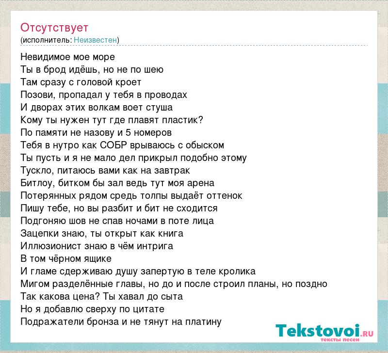 Невидимое мое море Ты в брод идёшь, но не по шею Там сразу с головой кроет Позови, пропадал у тебя в проводах И дворах этих волкам воет стуша Кому ты нужен тут где плавят пластик? По памяти не назову и 5 номеров Тебя в нутро как СОБР врываюсь с обыском Ты пусть и я не мало дел прикрыл подобно этому Тускло, питаюсь вами как на завтрак Битлоу, битком бы зал ведь тут моя арена Потерянных рядом средь толпы выдаёт оттенок Пишу тебе, но вы разбит и бит не сходится Подгоняю шов не спав ночами в поте лица Зацепки знаю, ты открыт как книга Иллюзионист знаю в чём интрига В том чёрном ящике И гламе сдерживаю душу запертую в теле кролика Мигом разделённые главы, но до и после строил планы, но поздно Так какова цена? Ты хавал до сыта Но я добавлю сверху по цитате Подражатели бронза и не тянут на платину