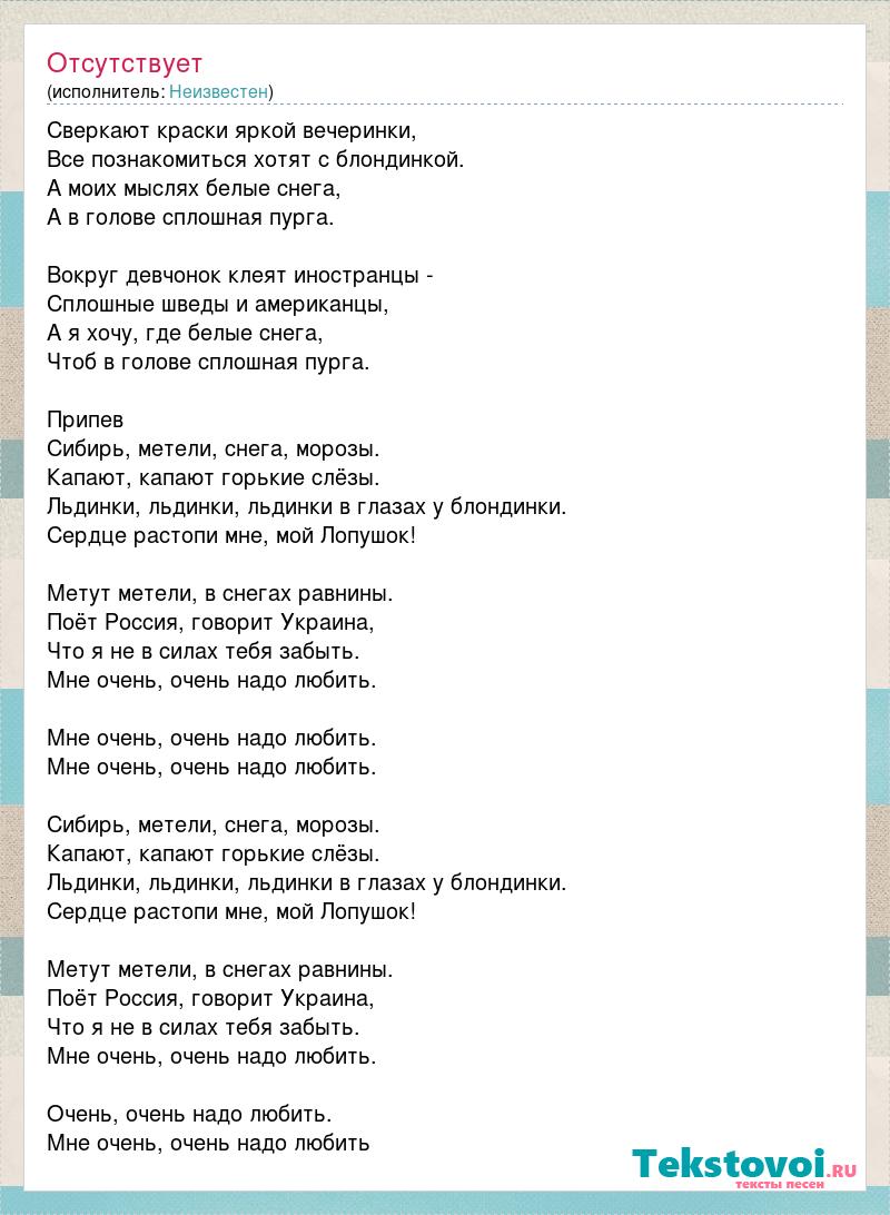 Сверкают краски яркой вечеринки, Все познакомиться хотят с блондинкой. А моих мыслях белые снега, А в голове сплошная пурга. Вокруг девчонок клеят иностранцы - Сплошные шведы и американцы, А я хочу, где белые снега, Чтоб в голове сплошная пурга. Припев Сибирь, метели, снега, морозы. Капают, капают горькие слёзы. Льдинки, льдинки, льдинки в глазах у блондинки. Сердце растопи мне, мой Лопушок! Метут метели, в снегах равнины. Поёт Россия, говорит Украина, Что я не в силах тебя забыть. Мне очень, очень надо любить. Мне очень, очень надо любить. Мне очень, очень надо любить. Сибирь, метели, снега, морозы. Капают, капают горькие слёзы. Льдинки, льдинки, льдинки в глазах у блондинки. Сердце растопи мне, мой Лопушок! Метут метели, в снегах равнины. Поёт Россия, говорит Украина, Что я не в силах тебя забыть. Мне очень, очень надо любить. Очень, очень надо любить. Мне очень, очень надо любить