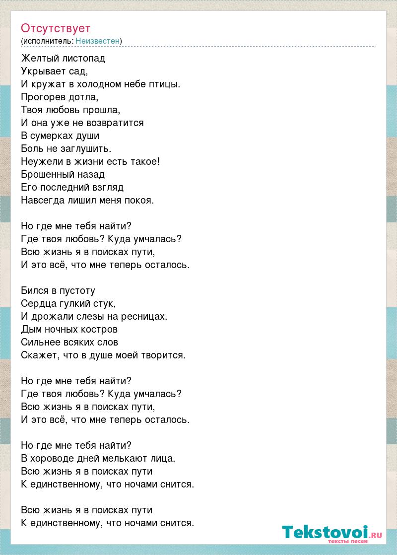 Желтый листопад Укрывает сад, И кружат в холодном небе птицы. Прогорев дотла, Твоя любовь прошла, И она уже не возвратится В сумерках души Боль не заглушить. Неужели в жизни есть такое! Брошенный назад Его последний взгляд Навсегда лишил меня покоя. Но где мне тебя найти? Где твоя любовь? Куда умчалась? Всю жизнь я в поисках пути, И это всё, что мне теперь осталось. Бился в пустоту Сердца гулкий стук, И дрожали слезы на ресницах. Дым ночных костров Сильнее всяких слов Скажет, что в душе моей творится. Но где мне тебя найти? Где твоя любовь? Куда умчалась? Всю жизнь я в поисках пути, И это всё, что мне теперь осталось. Но где мне тебя найти? В хороводе дней мелькают лица. Всю жизнь я в поисках пути К единственному, что ночами снится. Всю жизнь я в поисках пути К единственному, что ночами снится.