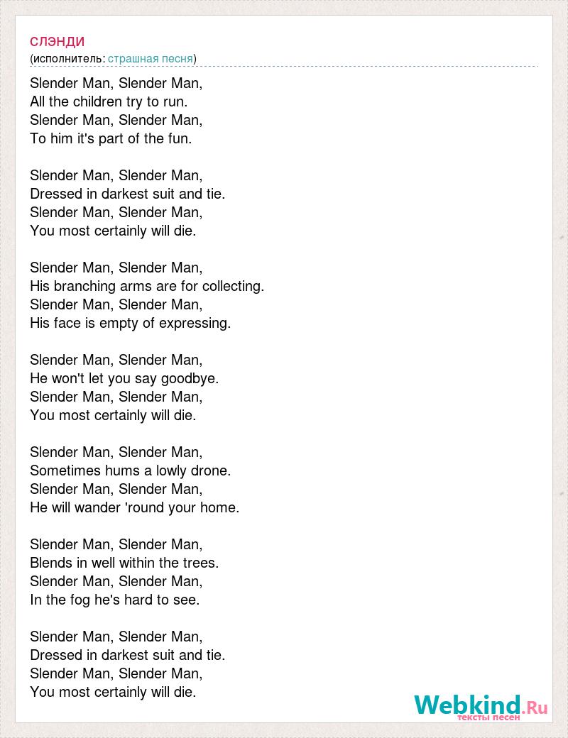 Slender Man, Slender Man, All the children try [bad word] Slender Man, Slender Man, To him it's part of the fun. Slender Man, Slender Man, Dressed in darkest suit and tie. Slender Man, Slender Man, You most certainly will die. Slender Man, Slender Man, His branching arms are for collecting. Slender Man, Slender Man, His face is empty of expressing. Slender Man, Slender Man, He won't let you say goodbye. Slender Man, Slender Man, You most certainly will die. Slender Man, Slender Man, Sometimes hums a lowly drone. Slender Man, Slender Man, He will wander 'round your home. Slender Man, Slender Man, Blends in well within the trees. Slender Man, Slender Man, In the fog he's hard to see. Slender Man, Slender Man, Dressed in darkest suit and tie. Slender Man, Slender Man, You most certainly will die.