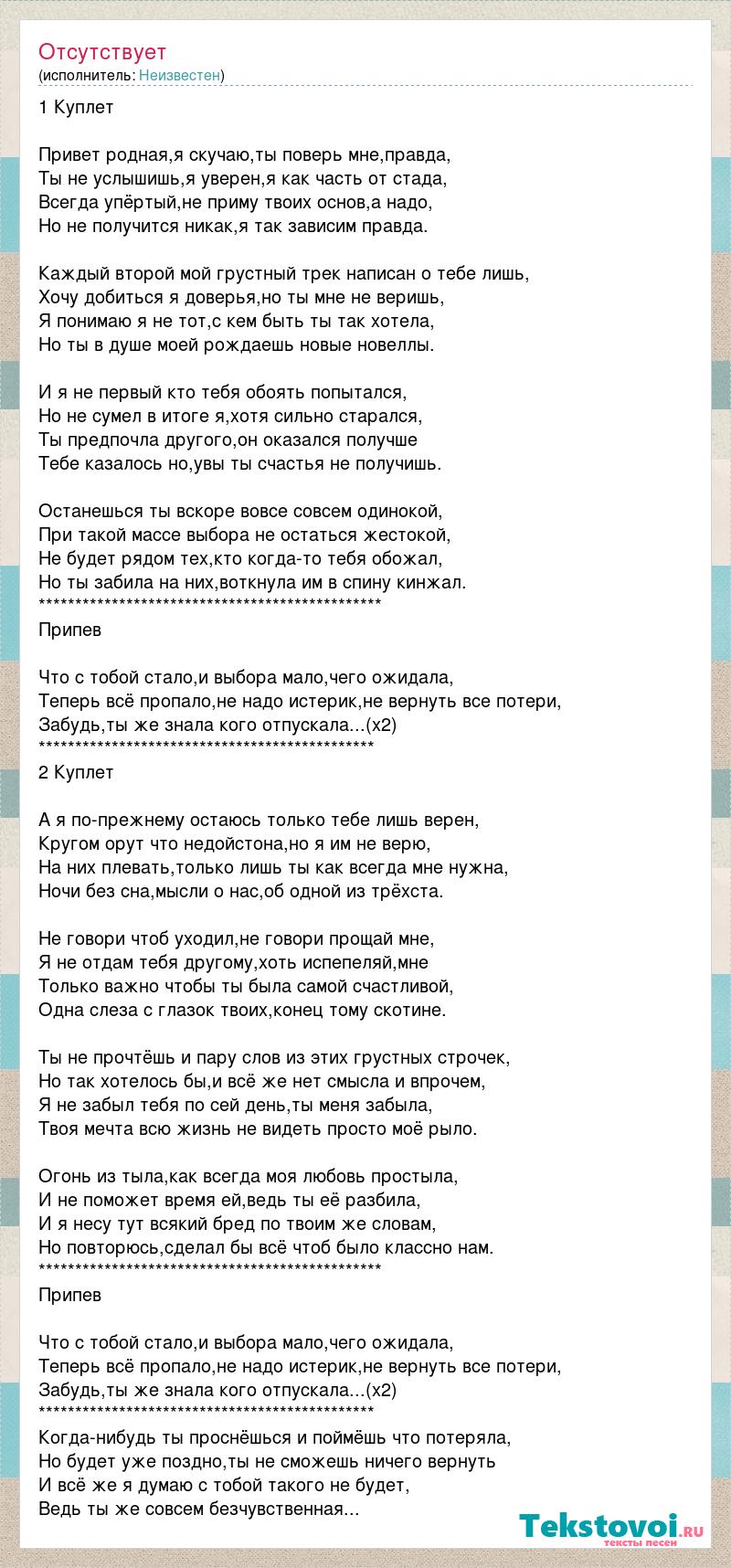 1 Куплет Привет родная,я скучаю,ты поверь мне,правда, Ты не услышишь,я уверен,я как часть от стада, Всегда упёртый,не приму твоих основ,а надо, Но не получится никак,я так зависим правда. Каждый второй мой грустный трек написан о тебе лишь, Хочу добиться я доверья,но ты мне не веришь, Я понимаю я не тот,с кем быть ты так хотела, Но ты в душе моей рождаешь новые новеллы. И я не первый кто тебя обоять попытался, Но не сумел в итоге я,хотя сильно старался, Ты предпочла другого,он оказался получше Тебе казалось но,увы ты счастья не получишь. Останешься ты вскоре вовсе совсем одинокой, При такой массе выбора не остаться жестокой, Не будет рядом тех,кто когда-то тебя обожал, Но ты забила на них,воткнула им в спину кинжал. *********************************************** Припев Что с тобой стало,и выбора мало,чего ожидала, Теперь всё пропало,не надо истерик,не вернуть все потери, Забудь,ты же знала кого отпускала...(х2) ********************************************** 2 Куплет А я по-прежнему остаюсь только тебе лишь верен, Кругом орут что недойстона,но я им не верю, На них плевать,только лишь ты как всегда мне нужна, Ночи без сна,мысли о нас,об одной из трёхста. Не говори чтоб уходил,не говори прощай мне, Я не отдам тебя другому,хоть испепеляй,мне Только важно чтобы ты была самой счастливой, Одна слеза с глазок твоих,конец тому скотине. Ты не прочтёшь и пару слов из этих грустных строчек, Но так хотелось бы,и всё же нет смысла и впрочем, Я не забыл тебя по сей день,ты меня забыла, Твоя мечта всю жизнь не видеть просто моё рыло. Огонь из тыла,как всегда моя любовь простыла, И не поможет время ей,ведь ты её разбила, И я несу тут всякий бред по твоим же словам, Но повторюсь,сделал бы всё чтоб было классно нам. *********************************************** Припев Что с тобой стало,и выбора мало,чего ожидала, Теперь всё пропало,не надо истерик,не вернуть все потери, Забудь,ты же знала кого отпускала...(х2) ********************************************** Когда-нибудь ты проснёшься и поймёшь что потеряла, Но будет уже поздно,ты не сможешь ничего вернуть И всё же я думаю с тобой такого не будет, Ведь ты же совсем безчувственная...