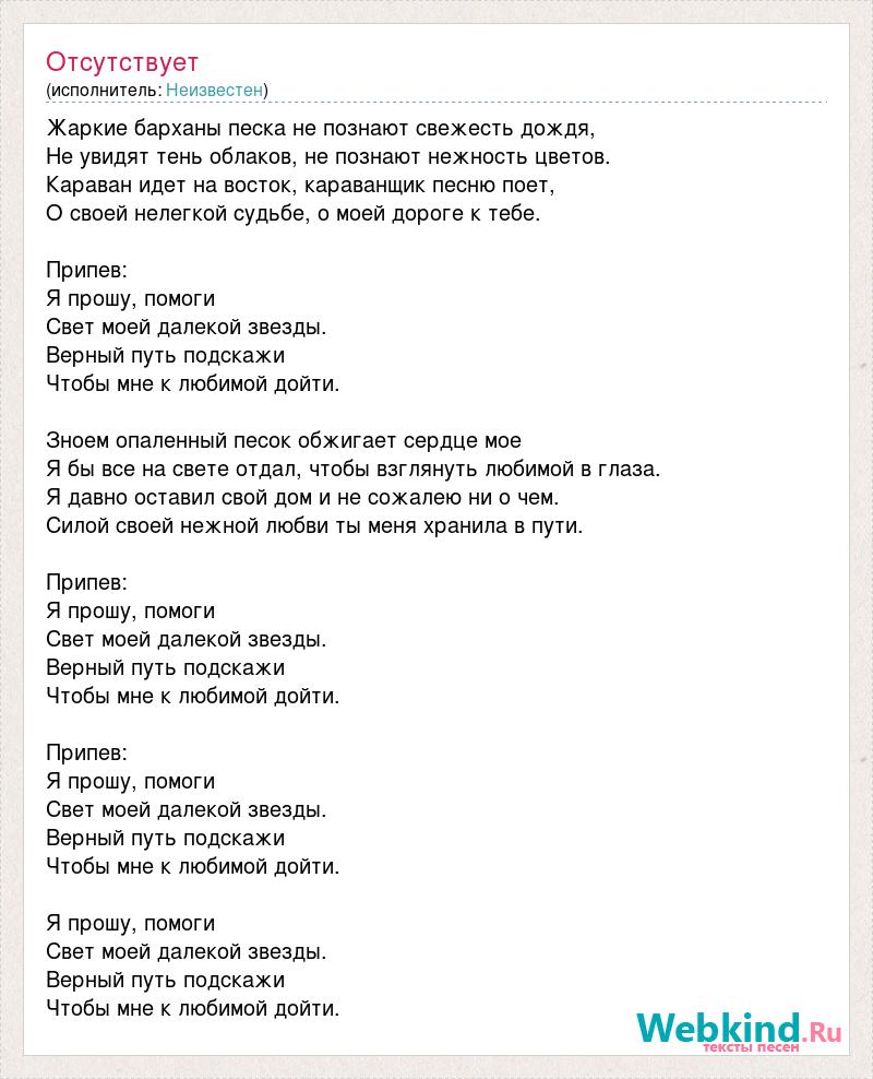 Жаркие барханы песка не познают свежесть дождя, Не увидят тень облаков, не познают нежность цветов. Караван идет на восток, караванщик песню поет, О своей нелегкой судьбе, о моей дороге к тебе. Припев: Я прошу, помоги Свет моей далекой звезды. Верный путь подскажи Чтобы мне к любимой дойти. Зноем опаленный песок обжигает сердце мое Я бы все на свете отдал, чтобы взглянуть любимой в глаза. Я давно оставил свой дом и не сожалею ни о чем. Силой своей нежной любви ты меня хранила в пути. Припев: Я прошу, помоги Свет моей далекой звезды. Верный путь подскажи Чтобы мне к любимой дойти. Припев: Я прошу, помоги Свет моей далекой звезды. Верный путь подскажи Чтобы мне к любимой дойти. Я прошу, помоги Свет моей далекой звезды. Верный путь подскажи Чтобы мне к любимой дойти.