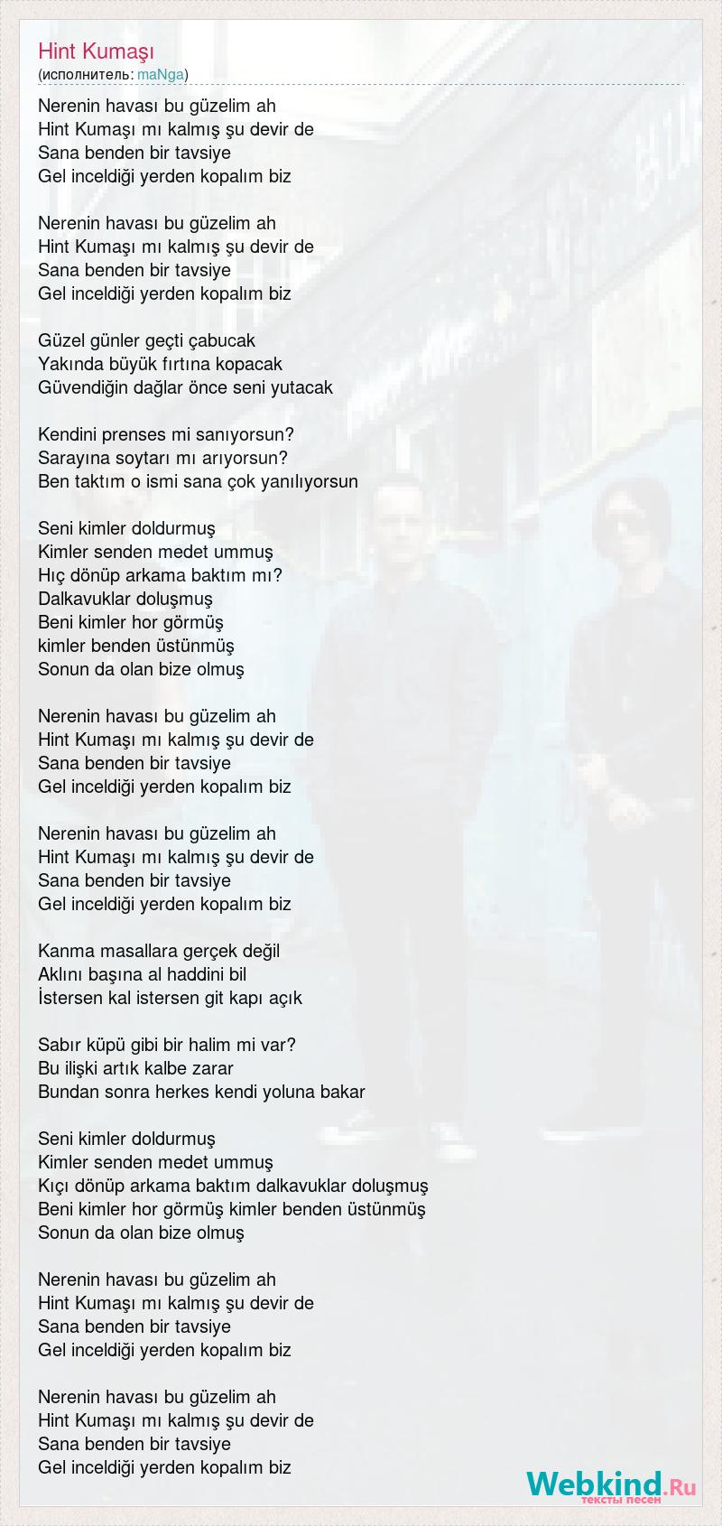 Nerenin havası bu güzelim ah Hint Kumaşı mı kalmış şu devir de Sana benden bir tavsiye Gel inceldiği yerden kopalım biz Nerenin havası bu güzelim ah Hint Kumaşı mı kalmış şu devir de Sana benden bir tavsiye Gel inceldiği yerden kopalım biz Güzel günler geçti çabucak Yakında büyük fırtına kopacak Güvendiğin dağlar önce seni yutacak Kendini prenses mi sanıyorsun? Sarayına soytarı mı arıyorsun? Ben taktım o ismi sana çok yanılıyorsun Seni kimler doldurmuş Kimler senden medet ummuş Hıç dönüp arkama baktım mı? Dalkavuklar doluşmuş Beni kimler hor görmüş kimler benden üstünmüş Sonun da olan bize olmuş Nerenin havası bu güzelim ah Hint Kumaşı mı kalmış şu devir de Sana benden bir tavsiye Gel inceldiği yerden kopalım biz Nerenin havası bu güzelim ah Hint Kumaşı mı kalmış şu devir de Sana benden bir tavsiye Gel inceldiği yerden kopalım biz Kanma masallara gerçek değil Aklını başına al haddini bil İstersen kal istersen git kapı açık Sabır küpü gibi bir halim mi var? Bu ilişki artık kalbe zarar Bundan sonra herkes kendi yoluna bakar Seni kimler doldurmuş Kimler senden medet ummuş Kıçı dönüp arkama baktım dalkavuklar doluşmuş Beni kimler hor görmüş kimler benden üstünmüş Sonun da olan bize olmuş Nerenin havası bu güzelim ah Hint Kumaşı mı kalmış şu devir de Sana benden bir tavsiye Gel inceldiği yerden kopalım biz Nerenin havası bu güzelim ah Hint Kumaşı mı kalmış şu devir de Sana benden bir tavsiye Gel inceldiği yerden kopalım biz