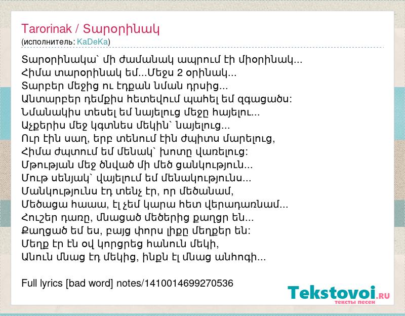 Տարօրինակա` մի ժամանակ ապրում էի միօրինակ... Հիմա տարօրինակ եմ...Մեջս 2 օրինակ... Տարբեր մեջից ու էդքան նման դրսից... Անտարբեր դեմքիս հետեվում պահել եմ զգացածս: Նմանակիս տեսել եմ նայելուց մեջը հայելու... Աչքերիս մեջ կգտնես մեկին` նայելուց... Ուր էին սաղ, երբ տենում էին ժպիտս մարելուց, Հիմա ժպտում եմ մենակ` խոտը վառելուց: Մթության մեջ ծնված մի մեծ ցանկություն... Մութ սենյակ` վայելում եմ մենակությունս... Մանկությունս էդ տենչ էր, որ մեծանամ, Մեծացա հաաա, էլ չեմ կարա հետ վերադառնամ... Հուշեր դառը, մնացած մեծերից քաղցր են... Քաղցած եմ ես, բայց փորս լիքը մեղքեր են: Մեղք էր էն օվ կորցրեց հանուն մեկի, Անուն մնաց էդ մեկից, ինքն էլ մնաց անհոգի... Full lyrics [bad word] notes/1410014699270536