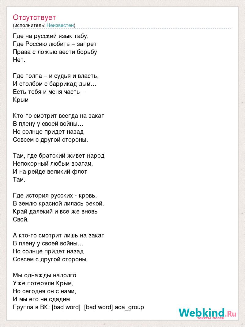 Где на русский язык табу, Где Россию любить – запрет Права с ложью вести борьбу Нет. Где толпа – и судья и власть, И столбом с баррикад дым… Есть тебя и меня часть – Крым Кто-то смотрит всегда на закат В плену у своей войны… Но солнце придет назад Совсем с другой стороны. Там, где братский живет народ Непокорный любым врагам, И на рейде великий флот Там. Где история русских - кровь. В землю красной лилась рекой. Край далекий и все же вновь Свой. А кто-то смотрит лишь на закат В плену у своей войны… Но солнце придет назад Совсем с другой стороны. Мы однажды надолго Уже потеряли Крым, Но сегодня он с нами, И мы его не сдадим Группа в ВК: [bad word] [bad word] ada_group