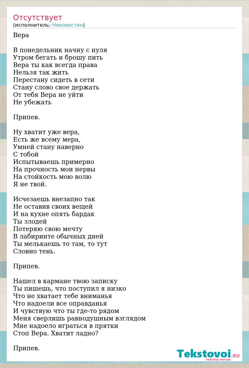 Вера В понедельник начну с нуля Утром бегать и брошу пить Вера ты как всегда права Нельзя так жить Перестану сидеть в сети Стану слово свое держать От тебя Вера не уйти Не убежать Припев. Ну хватит уже вера, Есть же всему мера, Умней стану наверно С тобой Испытываешь примерно На прочность мои нервы На стойкость мою волю Я не твой. Исчезаешь внезапно так Не оставив своих вещей И на кухне опять бардак Ты злодей Потеряю свою мечту В лабиринте обычных дней Ты мелькаешь то там, то тут Словно тень. Припев. Нашел в кармане твою записку Ты пишешь, что поступил я низко Что не хватает тебе вниманья Что надоели все оправданья И чувствую что ты где-то рядом Меня сверлишь равнодушным взглядом Мне надоело играться в прятки Стоп Вера. Хватит ладно? Припев.