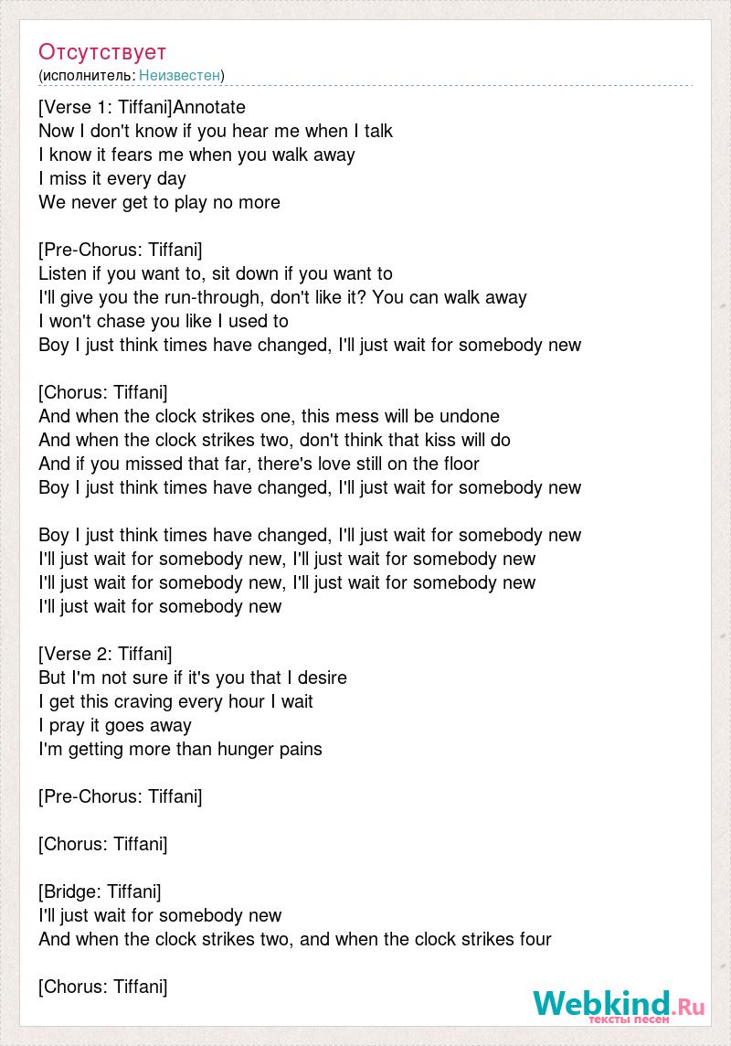 [Verse 1: Tiffani]Annotate Now I don't know if you hear me when I talk I know it fears me when you walk away I miss it every day We never get to play no more [bad word] Tiffani] Listen if you want to, sit down if you want to I'll give you [bad word] through, don't like it? You can walk away I won't chase you like I used to Boy I just think times have changed, I'll just wait for somebody new [bad word] Tiffani] And when the clock strikes one, this mess will be undone And when the clock strikes two, don't think that kiss will do And if you missed that far, there's love still on the floor Boy I just think times have changed, I'll just wait for somebody new Boy I just think times have changed, I'll just wait for somebody new I'll just wait for somebody new, I'll just wait for somebody new I'll just wait for somebody new, I'll just wait for somebody new I'll just wait for somebody new [Verse 2: Tiffani] But I'm not sure if it's you that I desire I get this craving every hour I wait I pray it goes away I'm getting more than hunger pains [bad word] Tiffani] [bad word] Tiffani] [Bridge: Tiffani] I'll just wait for somebody new And when the clock strikes two, and when the clock strikes four [bad word] Tiffani]