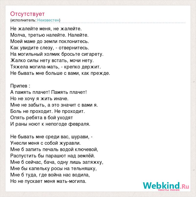 Не жалейте меня, не жалейте. Молча, третью налейте. Налейте. Моей маме до земли поклонитесь. Как увидите слезу, - отвернитесь. На могильный холмик бросьте сигарету. Жалко силы нету встать, мочи нету. Тяжела могила-мать, - крепко держит. Не бывать мне больше с вами, как прежде. Припев : А память плачет! Память плачет! Но не хочу я жить иначе. Мне не забыть, а это значит с вами я. Боль не проходит. Не проходит. Опять ребята в бой уходят И раны ноют к непогоде февраля. Не бывать мне среди вас, шурави, - Унесли меня с собой журавли. Мне б запить печаль водой ключевой, Распустить бы парашют над землёй. Мне б сейчас, бача, одну лишь затяжку, Мне бы капельку росы на тельняшку, Мне б туда, где война нас водила, Но не пускает меня мать-могила.