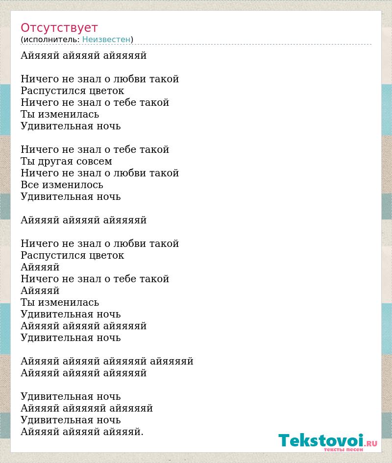 Айяяяй айяяяй айяяяяй Ничего не знал о любви такой Распустился цветок Ничего не знал о тебе такой Ты изменилась Удивительная ночь Ничего не знал о тебе такой Ты другая совсем Ничего не знал о любви такой Все изменилось Удивительная ночь Айяяяй айяяяй айяяяяй Ничего не знал о любви такой Распустился цветок Айяяяй Ничего не знал о тебе такой Айяяяй Ты изменилась Удивительная ночь Айяяяй айяяяй айяяяяй Удивительная ночь Айяяяй айяяяй айяяяяй айяяяяй Айяяяй айяяяй айяяяяй Удивительная ночь Айяяяй айяяяяй айяяяяй Удивительная ночь Айяяяй айяяяй айяяяй.