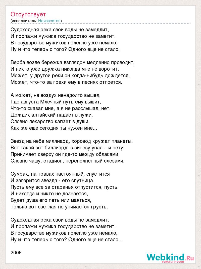 Судоходная река свои воды не замедлит, И пропажи мужика государство не заметит. В государстве мужиков полегло уже немало, Ну и что теперь с того? Одного еще не стало. Верба возле бережка взглядом медленно проводит, И никто уже дружка никогда мне не воротит. Может, у другой реки он когда-нибудь дождется, Может, что-то за грехи ему в песнях отпоется. А может, на воздух ненадолго вышел, Где августа Млечный путь ему вышит, Что-то сказал мне, а я не расслышал, нет. Дождик алтайский падает в лужи, Словно лекарство капает в души, Как же еще сегодня ты нужен мне... Звезд на небе миллиард, хоровод кружат планеты. Вот такой вот биллиард, в синеву упал – и нету. Принимает сверху он где-то между облаками Словно чашу, стадион, переполненный слезами. Сумрак, на травах настоянный, спустится И загорится звезда - его спутница. Пусть ему все за старанья отпустится, пусть. И никогда и никто не дознается, Будет душа его петь или маяться, Только вот светлая не унимается грусть. Судоходная река свои воды не замедлит, И пропажи мужика государство не заметит. В государстве мужиков полегло уже немало, Ну и что теперь с того? Одного еще не стало... 2006