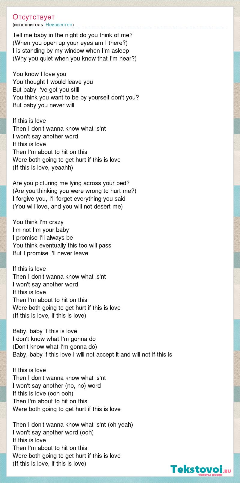 Tell me baby in the night do you think of me? (When you open up your eyes am I there?) I is standing by my window when I'm asleep (Why you quiet when you know that I'm near?) You know I love you You thought I would leave you But baby I've got you still You think you want to be by yourself don't you? But baby you never will If this is love Then I don't wanna know what is'nt I won't say another word If this is love Then I'm about to hit on this Were both going to get hurt if this is love (If this is love, yeaahh) Are you picturing me lying across your bed? (Are you thinking you were wrong to hurt me?) I forgive you, I'll forget everything you said (You will love, and you will not desert me) You think I'm crazy I'm not I'm your baby I promise I'll always be You think eventually this too will pass But I promise I'll never leave If this is love Then I don't wanna know what is'nt I won't say another word If this is love Then I'm about to hit on this Were both going to get hurt if this is love (If this is love, if this is love) Baby, baby if this is love I don't know what I'm gonna do (Don't know what I'm gonna do) Baby, baby if this love I will not accept it and will not if this is If this is love Then I don't wanna know what is'nt I won't say another (no, no) word If this is love (ooh ooh) Then I'm about to hit on this Were both going to get hurt if this is love Then I don't wanna know what is'nt (oh yeah) I won't say another word (ooh) If this is love Then I'm about to hit on this Were both going to get hurt if this is love (If this is love, if this is love)