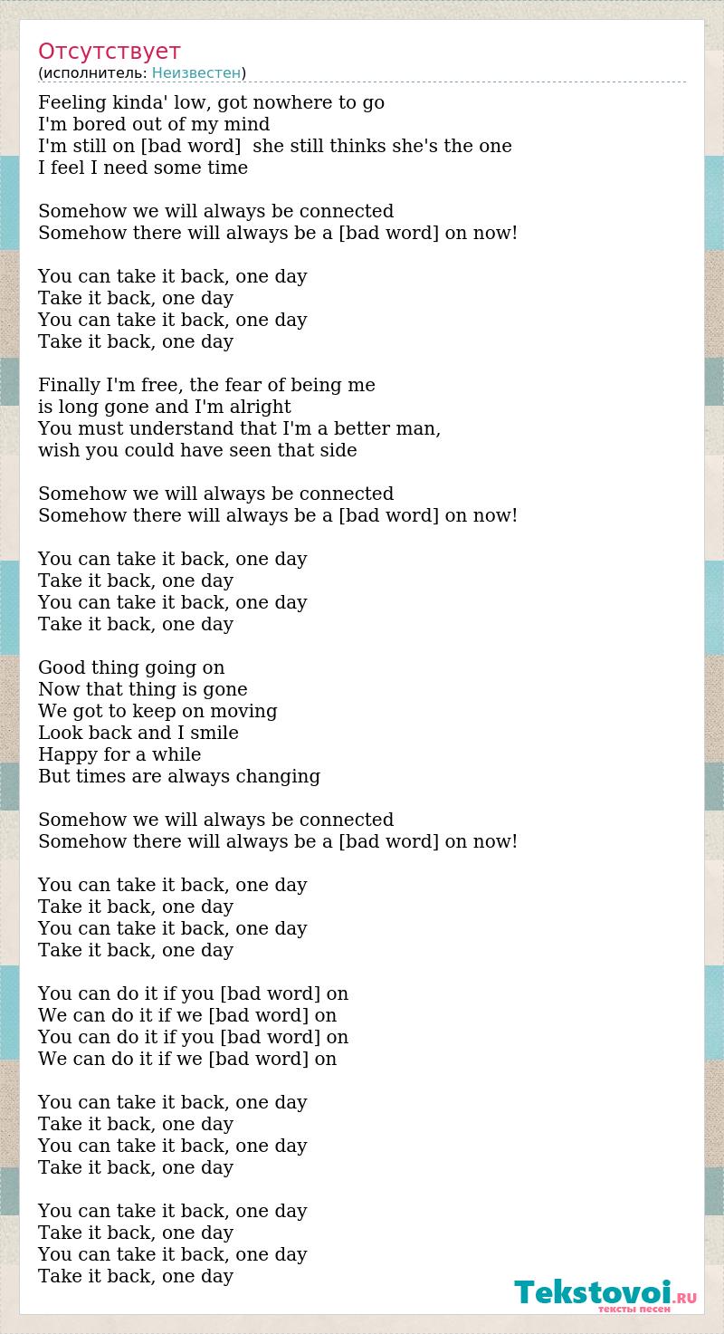 Feeling kinda' low, got nowhere to go I'm bored out of my mind I'm still on [bad word] she still thinks she's the one I feel I need some time Somehow we will always be connected Somehow there will always be a [bad word] on now! You can take it back, one day Take it back, one day You can take it back, one day Take it back, one day Finally I'm free, the fear of being me is long gone and I'm alright You must understand that I'm a better man, wish you could have seen that side Somehow we will always be connected Somehow there will always be a [bad word] on now! You can take it back, one day Take it back, one day You can take it back, one day Take it back, one day Good thing going on Now that thing is gone We got to keep on moving Look back and I smile Happy for a while But times are always changing Somehow we will always be connected Somehow there will always be a [bad word] on now! You can take it back, one day Take it back, one day You can take it back, one day Take it back, one day You can do it if you [bad word] on We can do it if we [bad word] on You can do it if you [bad word] on We can do it if we [bad word] on You can take it back, one day Take it back, one day You can take it back, one day Take it back, one day You can take it back, one day Take it back, one day You can take it back, one day Take it back, one day