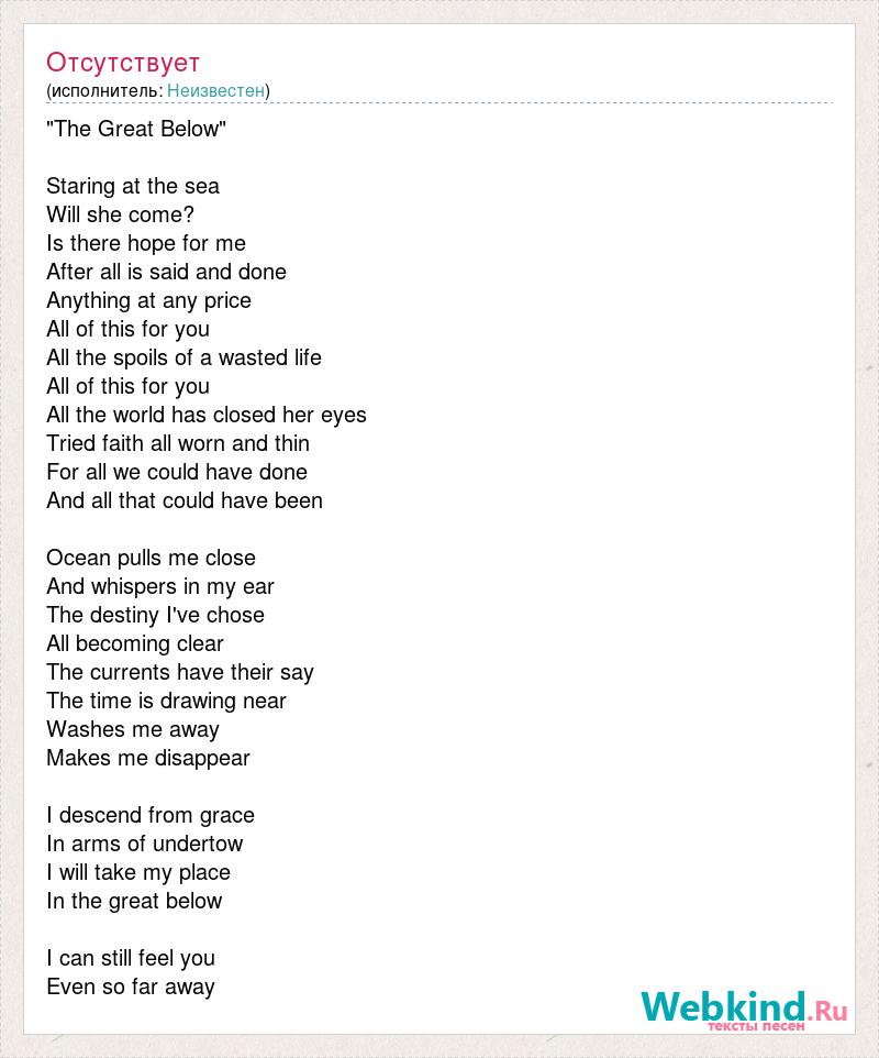 "The Great Below" Staring at the sea Will [bad word] Is there hope for me After all is said and done Anything at any price All of this for you All the spoils of a wasted life All of this for you All the world has closed her eyes Tried faith all worn and thin For all we could have done And all that could have been Ocean pulls me close And whispers in my ear The destiny I've chose All [bad word] clear The currents have their say The time is drawing near Washes me away Makes me disappear I descend from grace In arms of undertow I will take my place In the great below I can still feel you Even so far away