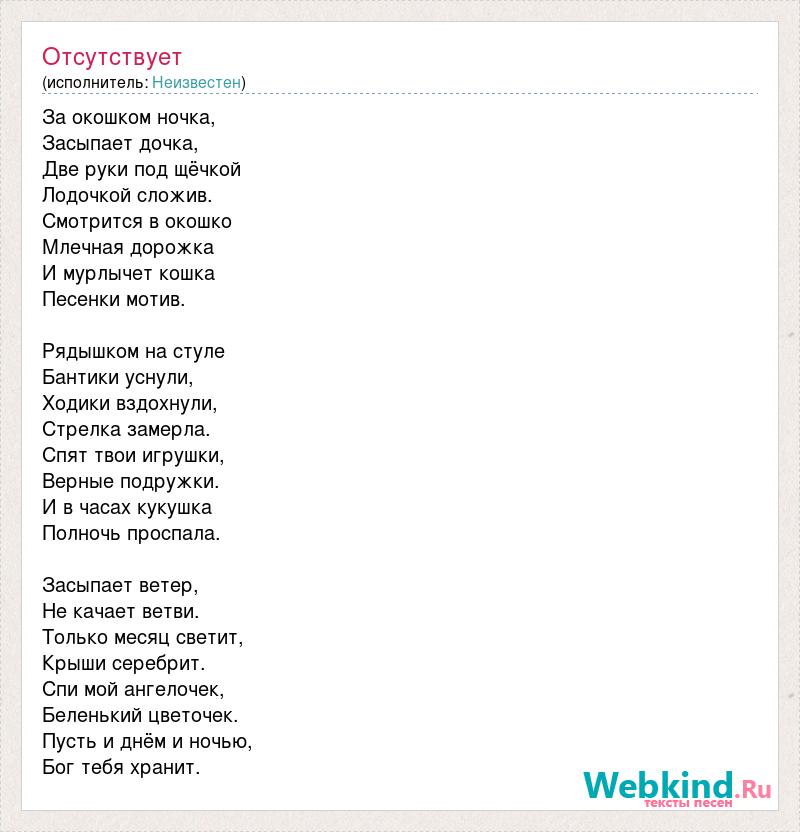 За окошком ночка, Засыпает дочка, Две руки под щёчкой Лодочкой сложив. Смотрится в окошко Млечная дорожка И мурлычет кошка Песенки мотив. Рядышком на стуле Бантики уснули, Ходики вздохнули, Стрелка замерла. Спят твои игрушки, Верные подружки. И в часах кукушка Полночь проспала. Засыпает ветер, Не качает ветви. Только месяц светит, Крыши серебрит. Спи мой ангелочек, Беленький цветочек. Пусть и днём и ночью, Бог тебя хранит.