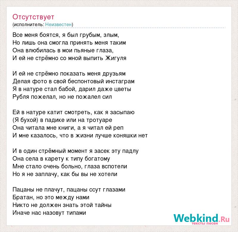 Все меня боятся, я был грубым, злым, Но лишь она смогла принять меня таким Она влюбилась в мои пьяные глаза, И ей не стрёмно со мной выпить Жигуля И ей не стрёмно показать меня друзьям Делая фото в свой беспонтовый инстаграм Я в натуре стал бабой, дарил даже цветы Рубля пожелал, но не пожалел сил Ей в натуре катит смотреть, как я засыпаю (Я бухой) в падике или на тротуаре Она читала мне книги, а я читал ей реп И мне казалось, что в жизни лучше коняшки нет И в один стрёмный момент я засек эту падлу Она села в карету к типу богатому Мне стало очень больно, глаза вспотели Но я не заплачу, как бы вы не хотели Пацаны не плачут, пацаны ссут глазами Братан, но это между нами Никто не должен знать этой тайны Иначе нас назовут типами