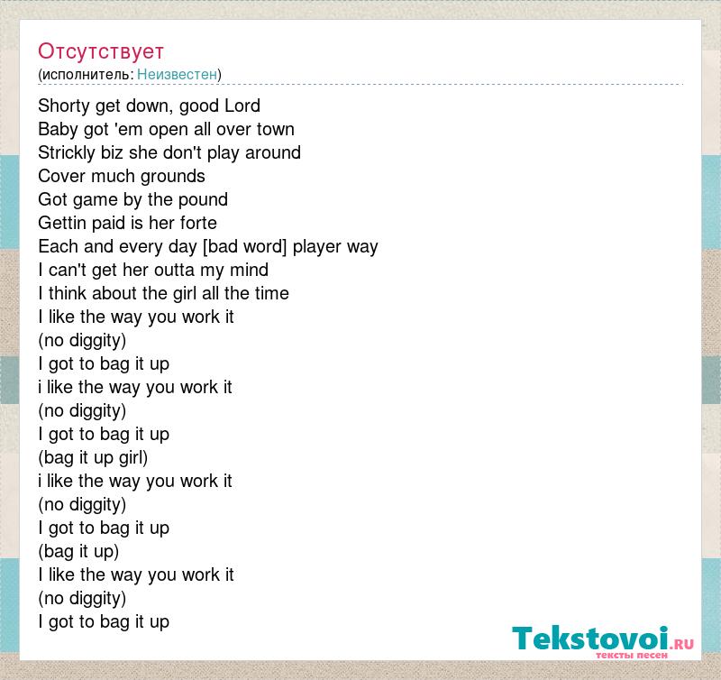 Shorty get down, good Lord Baby got 'em open all over town Strickly biz she don't play around Cover much grounds Got game by the pound Gettin paid is her forte Each and every day [bad word] player way I can't get her outta my mind I think about the girl all the time I like the way you work it (no diggity) I got to bag it up i like the way you work it (no diggity) I got to bag it up (bag it up girl) i like the way you work it (no diggity) I got to bag it up (bag it up) I like the way you work it (no diggity) I got to bag it up