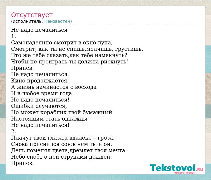 Не надо печалиться 1. Самонадеянно смотрит в окно луна, Смотрит, как ты не спишь,молчишь, грустишь. Что же тебе сказать,как тебе намекнуть? Чтобы не проиграть,ты должна рискнуть! Припев: Не надо печалиться, Кино продолжается. А жизнь начинается с восхода И в любое время года Не надо печалиться! Ошибки случаются, Но может кораблик твой бумажный Настоящим стать однажды. Не надо печалиться! 2. Плачут твои глаза,а вдалеке – гроза. Снова приснился сон:в нём ты и он. День поменял цвета,дремлет твоя мечта. Небо споёт о ней струнами дождей. Припев.