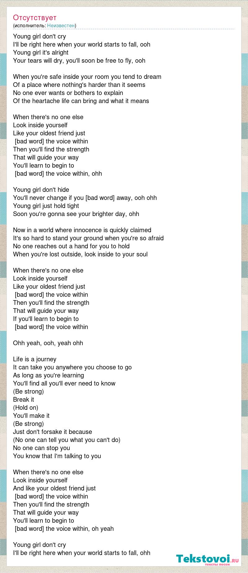 Young girl don't cry I'll be right here when your world starts to fall, ooh Young girl it's alright Your tears will dry, you'll soon be free to fly, ooh When you're safe inside your room you tend to dream Of a place where nothing's harder than it seems No one ever wants or bothers to explain Of the heartache life can bring and what it means When there's no one else Look inside yourself Like your oldest friend just [bad word] the voice within Then you'll find the strength That will guide your way You'll learn to begin to [bad word] the voice within, ohh Young girl don't hide You'll never change if you [bad word] away, ooh ohh Young girl just hold tight Soon you're gonna see your brighter day, ohh Now in a world where innocence is quickly claimed It's so hard to stand your ground when you're so afraid No one reaches out a hand for you to hold When you're lost outside, look inside to your soul When there's no one else Look inside yourself Like your oldest friend just [bad word] the voice within Then you'll find the strength That will guide your way If you'll learn to begin to [bad word] the voice within Ohh yeah, ooh, yeah ohh Life is a journey It can take you anywhere you choose to go As long as you're learning You'll find all you'll ever need to know (Be strong) Break it (Hold on) You'll make it (Be strong) Just don't forsake it because (No one can tell you what you can't do) No one can stop you You know that I'm talking to you When there's no one else Look inside yourself And like your oldest friend just [bad word] the voice within Then you'll find the strength That will guide your way You'll learn to begin to [bad word] the voice within, oh yeah Young girl don't cry I'll be right here when your world starts to fall, ohh