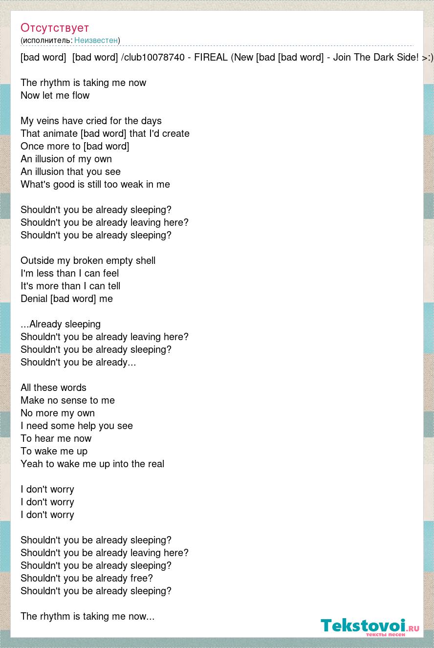 [bad word] [bad word] /club10078740 - FIREAL (New [bad [bad word] - Join The Dark Side! >:) The rhythm is taking me now Now let me flow My veins have cried for the days That animate [bad word] that I'd create Once more to [bad word] An illusion of my own An illusion that you see What's good is still too weak in me Shouldn't you be already sleeping? Shouldn't you be already leaving here? Shouldn't you be already sleeping? Outside my broken empty shell I'm less than I can feel It's more than I can tell Denial [bad word] me ...Already sleeping Shouldn't you be already leaving here? Shouldn't you be already sleeping? Shouldn't you be already... All these words Make no sense to me No more my own I need some help you see To hear me now To wake me up Yeah to wake me up into the real I don't worry I don't worry I don't worry Shouldn't you be already sleeping? Shouldn't you be already leaving here? Shouldn't you be already sleeping? Shouldn't you be already free? Shouldn't you be already sleeping? The rhythm is taking me now...