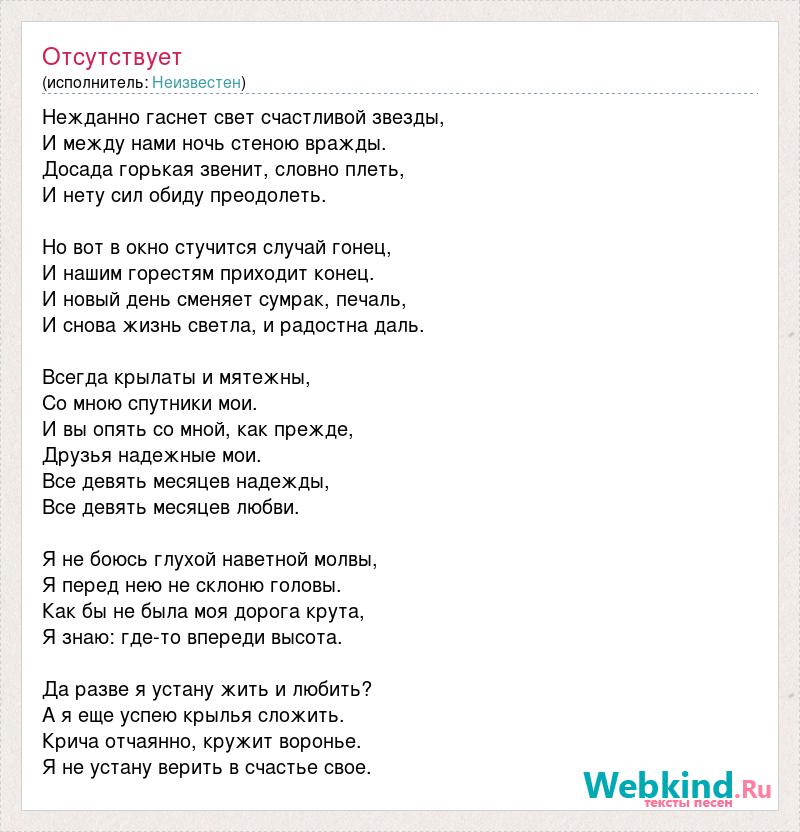 Нежданно гаснет свет счастливой звезды, И между нами ночь стеною вражды. Досада горькая звенит, словно плеть, И нету сил обиду преодолеть. Но вот в окно стучится случай гонец, И нашим горестям приходит конец. И новый день сменяет сумрак, печаль, И снова жизнь светла, и радостна даль. Всегда крылаты и мятежны, Со мною спутники мои. И вы опять со мной, как прежде, Друзья надежные мои. Все девять месяцев надежды, Все девять месяцев любви. Я не боюсь глухой наветной молвы, Я перед нею не склоню головы. Как бы не была моя дорога крута, Я знаю: где-то впереди высота. Да разве я устану жить и любить? А я еще успею крылья сложить. Крича отчаянно, кружит воронье. Я не устану верить в счастье свое.