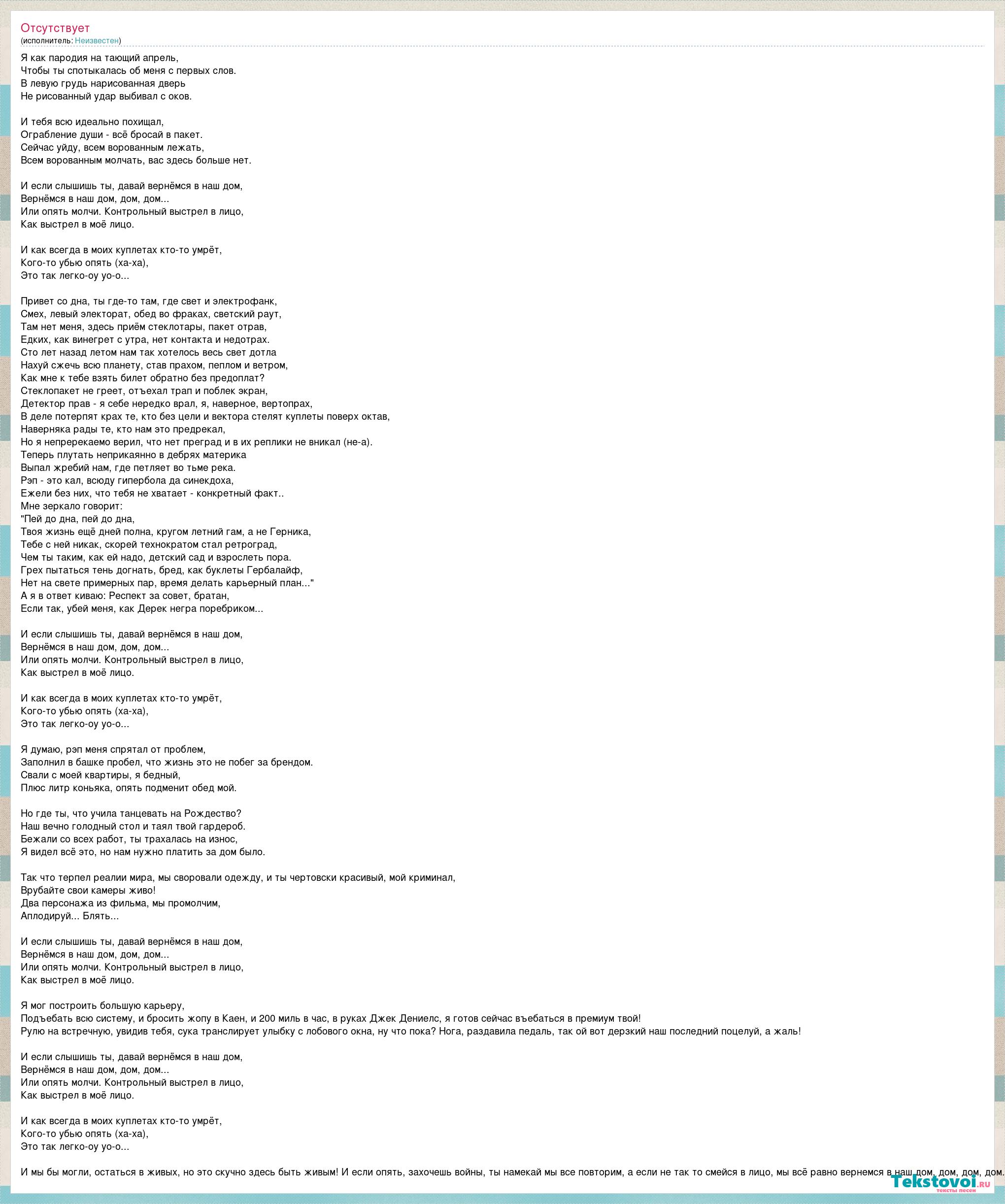 Я как пародия на тающий апрель, Чтобы ты спотыкалась об меня с первых слов. В левую грудь нарисованная дверь Не рисованный удар выбивал с оков. И тебя всю идеально похищал, Ограбление души - всё бросай в пакет. Сейчас уйду, всем ворованным лежать, Всем ворованным молчать, вас здесь больше нет. И если слышишь ты, давай вернёмся в наш дом, Вернёмся в наш дом, дом, дом... Или опять молчи. Контрольный выстрел в лицо, Как выстрел в моё лицо. И как всегда в моих куплетах кто-то умрёт, Кого-то убью опять (ха-ха), Это так легко-оу уо-о... Привет со дна, ты где-то там, где свет и электрофанк, Смех, левый электорат, обед во фраках, светский раут, Там нет меня, здесь приём стеклотары, пакет отрав, Едких, как винегрет с утра, нет контакта и недотрах. Сто лет назад летом нам так хотелось весь свет дотла Нахуй сжечь всю планету, став прахом, пеплом и ветром, Как мне к тебе взять билет обратно без предоплат? Стеклопакет не греет, отъехал трап и поблек экран, Детектор прав - я себе нередко врал, я, наверное, вертопрах, В деле потерпят крах те, кто без цели и вектора стелят куплеты поверх октав, Наверняка рады те, кто нам это предрекал, Но я непререкаемо верил, что нет преград и в их реплики не вникал (не-а). Теперь плутать неприкаянно в дебрях материка Выпал жребий нам, где петляет во тьме река. Рэп - это кал, всюду гипербола да синекдоха, Ежели без них, что тебя не хватает - конкретный факт.. Мне зеркало говорит: "Пей до дна, пей до дна, Твоя жизнь ещё дней полна, кругом летний гам, а не Герника, Тебе с ней никак, скорей технократом стал ретроград, Чем ты таким, как ей надо, детский сад и взрослеть пора. Грех пытаться тень догнать, бред, как буклеты Гербалайф, Нет на свете примерных пар, время делать карьерный план..." А я в ответ киваю: Респект за совет, братан, Если так, убей меня, как Дерек негра поребриком... И если слышишь ты, давай вернёмся в наш дом, Вернёмся в наш дом, дом, дом... Или опять молчи. Контрольный выстрел в лицо, Как выстрел в моё лицо. И как всегда в моих куплетах кто-то умрёт, Кого-то убью опять (ха-ха), Это так легко-оу уо-о... Я думаю, рэп меня спрятал от проблем, Заполнил в башке пробел, что жизнь это не побег за брендом. Свали с моей квартиры, я бедный, Плюс литр коньяка, опять подменит обед мой. Но где ты, что учила танцевать на Рождество? Наш вечно голодный стол и таял твой гардероб. Бежали со всех работ, ты трахалась на износ, Я видел всё это, но нам нужно платить за дом было. Так что терпел реалии мира, мы своровали одежду, и ты чертовски красивый, мой криминал, Врубайте свои камеры живо! Два персонажа из фильма, мы промолчим, Аплодируй... Блять... И если слышишь ты, давай вернёмся в наш дом, Вернёмся в наш дом, дом, дом... Или опять молчи. Контрольный выстрел в лицо, Как выстрел в моё лицо. Я мог построить большую карьеру, Подъебать всю систему, и бросить жопу в Каен, и 200 миль в час, в руках Джек Дениелс, я готов сейчас въебаться в премиум твой! Рулю на встречную, увидив тебя, сука транслирует улыбку с лобового окна, ну что пока? Нога, раздавила педаль, так ой вот дерзкий наш последний поцелуй, а жаль! И если слышишь ты, давай вернёмся в наш дом, Вернёмся в наш дом, дом, дом... Или опять молчи. Контрольный выстрел в лицо, Как выстрел в моё лицо. И как всегда в моих куплетах кто-то умрёт, Кого-то убью опять (ха-ха), Это так легко-оу уо-о... И мы бы могли, остаться в живых, но это скучно здесь быть живым! И если опять, 