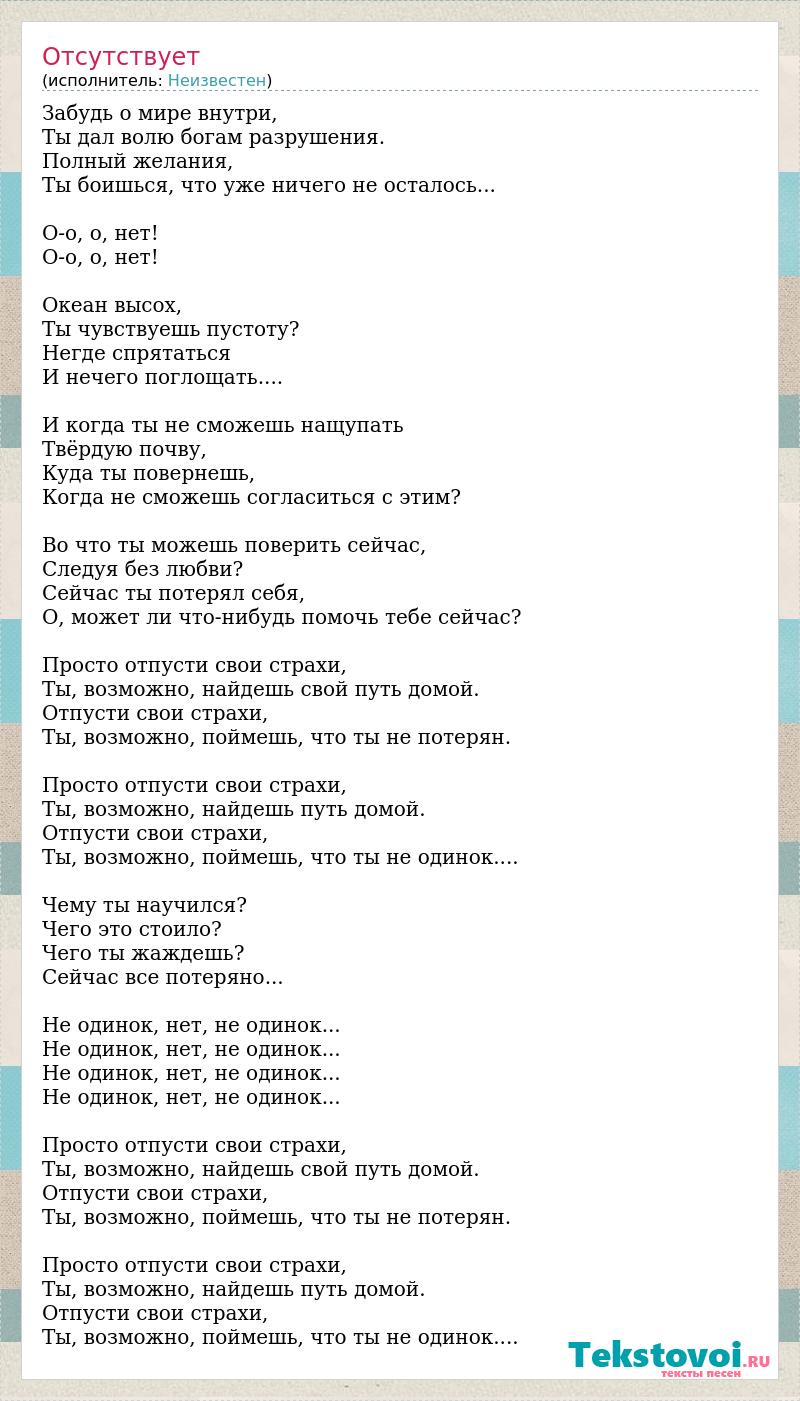 Забудь о мире внутри, Ты дал волю богам разрушения. Полный желания, Ты боишься, что уже ничего не осталось... О-о, о, нет! О-о, о, нет! Океан высох, Ты чувствуешь пустоту? Негде спрятаться И нечего поглощать.... И когда ты не сможешь нащупать Твёрдую почву, Куда ты повернешь, Когда не сможешь согласиться с этим? Во что ты можешь поверить сейчас, Следуя без любви? Сейчас ты потерял себя, О, может ли что-нибудь помочь тебе сейчас? Просто отпусти свои страхи, Ты, возможно, найдешь свой путь домой. Отпусти свои страхи, Ты, возможно, поймешь, что ты не потерян. Просто отпусти свои страхи, Ты, возможно, найдешь путь домой. Отпусти свои страхи, Ты, возможно, поймешь, что ты не одинок.... Чему ты научился? Чего это стоило? Чего ты жаждешь? Сейчас все потеряно... Не одинок, нет, не одинок... Не одинок, нет, не одинок... Не одинок, нет, не одинок... Не одинок, нет, не одинок... Просто отпусти свои страхи, Ты, возможно, найдешь свой путь домой. Отпусти свои страхи, Ты, возможно, поймешь, что ты не потерян. Просто отпусти свои страхи, Ты, возможно, найдешь путь домой. Отпусти свои страхи, Ты, возможно, поймешь, что ты не одинок....