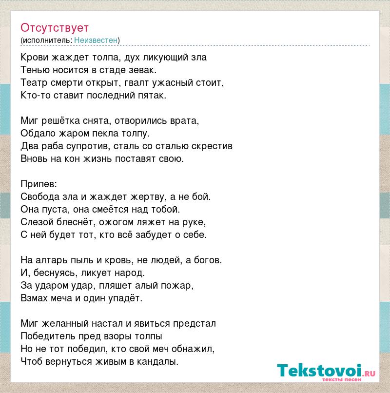 Крови жаждет толпа, дух ликующий зла Тенью носится в стаде зевак. Театр смерти открыт, гвалт ужасный стоит, Кто-то ставит последний пятак. Миг решётка снята, отворились врата, Обдало жаром пекла толпу. Два раба супротив, сталь со сталью скрестив Вновь на кон жизнь поставят свою. Припев: Свобода зла и жаждет жертву, а не бой. Она пуста, она смеётся над тобой. Слезой блеснёт, ожогом ляжет на руке, С ней будет тот, кто всё забудет о себе. На алтарь пыль и кровь, не людей, а богов. И, беснуясь, ликует народ. За ударом удар, пляшет алый пожар, Взмах меча и один упадёт. Миг желанный настал и явиться предстал Победитель пред взоры толпы Но не тот победил, кто свой меч обнажил, Чтоб вернуться живым в кандалы.