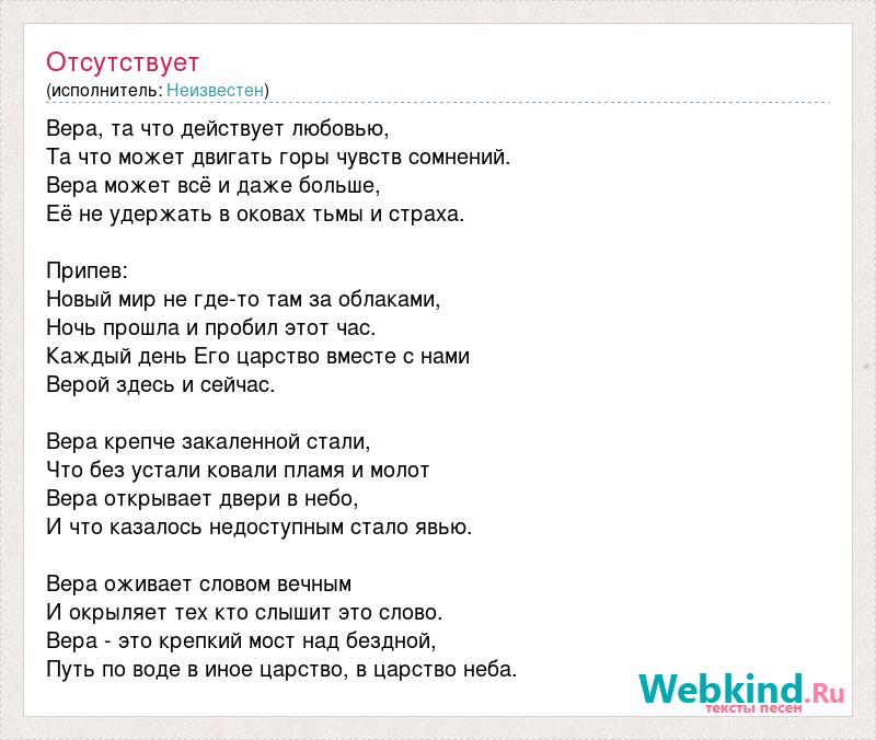 Вера, та что действует любовью, Та что может двигать горы чувств сомнений. Вера может всё и даже больше, Её не удержать в оковах тьмы и страха. Припев: Новый мир не где-то там за облаками, Ночь прошла и пробил этот час. Каждый день Его царство вместе с нами Верой здесь и сейчас. Вера крепче закаленной стали, Что без устали ковали пламя и молот Вера открывает двери в небо, И что казалось недоступным стало явью. Вера оживает словом вечным И окрыляет тех кто слышит это слово. Вера - это крепкий мост над бездной, Путь по воде в иное царство, в царство неба.