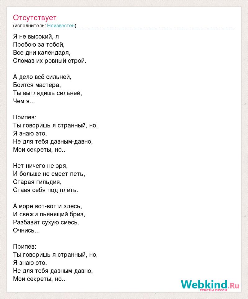 Я не высокий, я Пробою за тобой, Все дни календаря, Сломав их ровный строй. А дело всё сильней, Боится мастера, Ты выглядишь сильней, Чем я... Припев: Ты говоришь я странный, но, Я знаю это. Не для тебя давным-давно, Мои секреты, но.. Нет ничего не зря, И больше не смеет петь, Старая гильдия, Ставя себя под плеть. А море вот-вот и здесь, И свежи пьянящий бриз, Разбавит сухую смесь. Очнись... Припев: Ты говоришь я странный, но, Я знаю это. Не для тебя давным-давно, Мои секреты, но..