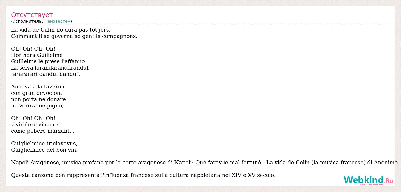 La vida de Culin no dura pas tot jors. [bad word] il se governa so [bad word] Oh! Oh! Oh! Oh! Hor hora Guillelme Guillelme le prese l'affanno La selva larandarandaranduf tarararari danduf danduf. Andava a la taverna con gran devocion, non porta ne donare ne voreza ne pigno, Oh! Oh! Oh! Oh! viviridere vinacre [bad word] pobere marzant... Guiglielmice triciavavus, Guiglielmice del bon vin. Napoli Aragonese, musica profana per la corte aragonese di Napoli: Que faray ie mal fortunè - La vida de Colin (la musica francese) di Anonimo. Questa canzone ben rappresenta l'influenza francese sulla cultura napoletana nel XIV e XV secolo.