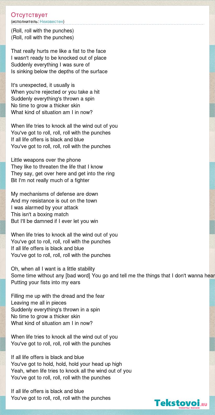 (Roll, roll with the punches) (Roll, roll with the punches) That really hurts me like a fist to the face I wasn't ready to be knocked out of place Suddenly everything I was sure of Is sinking below the depths of the surface It's unexpected, it usually is When you're rejected or you take a hit Suddenly everything's thrown a spin No time to grow a thicker skin What kind of situation am I in now? When life tries to knock all the wind out of you You've got to roll, roll, roll with the punches If all life offers is black and blue You've got to roll, roll, roll with the punches Little weapons over the phone They like to threaten the life that I know They say, get over here and get into the ring Bit I'm not really much of a fighter My mechanisms of defense are down And my resistance is out on the town I was alarmed by your attack This isn't a boxing match But I'll be damned if I ever let you win When life tries to knock all the wind out of you You've got to roll, roll, roll with the punches If all life offers is black and blue You've got to roll, roll, roll with the punches Oh, when all I want is a little stability Some time without any [bad word] You go and tell me the things that I don't wanna hear Putting your fists into my ears Filling me up with the dread and the fear Leaving me all in pieces Suddenly everything's thrown in a spin No time to grow a thicker skin What kind of situation am I in now? When life tries to knock all the wind out of you You've got to roll, roll, roll with the punches If all life offers is black and blue You've got to hold, hold, hold your head up high Yeah, when life tries to knock all the wind out of you You've got to roll, roll, roll with the punches If all life offers is black and blue You've got to roll, roll, roll with the punches