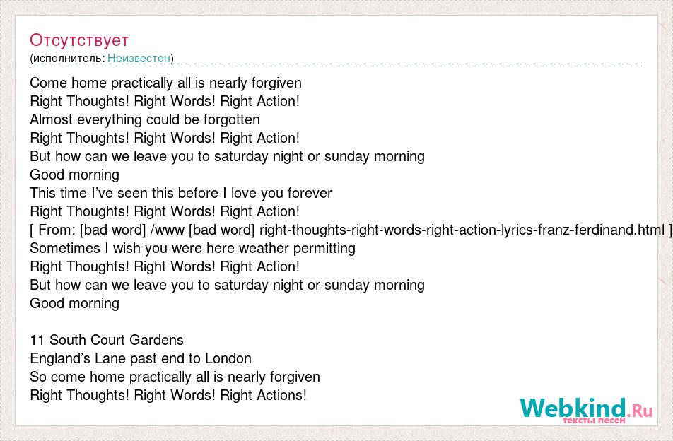 [bad word] home practically all is nearly forgiven Right Thoughts! Right Words! Right Action! Almost everything could be forgotten Right Thoughts! Right Words! Right Action! But how can we leave you to saturday night or sunday morning Good morning This time I’ve seen this before I love you forever Right Thoughts! Right Words! Right Action! [ From: [bad word] /www [bad word] right-thoughts-right-words-right-action-lyrics-franz-ferdinand.html ] Sometimes I wish you were here weather permitting Right Thoughts! Right Words! Right Action! But how can we leave you to saturday night or sunday morning Good morning 11 South Court Gardens England’s Lane past end to London [bad word] home practically all is nearly forgiven Right Thoughts! Right Words! Right Actions!