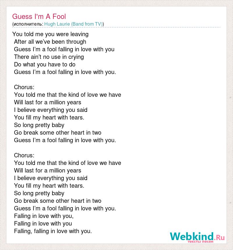 You told me you were leaving After all we’ve been through Guess I’m a fool falling in love with you There ain’t no use in crying Do what you have to do Guess I’m a fool falling in love with you. [bad word] You told me that the kind of love we have Will last for a million years I believe everything you said You fill my heart with tears. So long pretty baby Go break some other heart in two Guess I’m a fool falling in love with you. [bad word] You told me that the kind of love we have Will last for a million years I believe everything you said You fill my heart with tears. So long pretty baby Go break some other heart in two Guess I’m a fool falling in love with you. Falling in love with you, Falling in love with you Falling, falling in love with you.