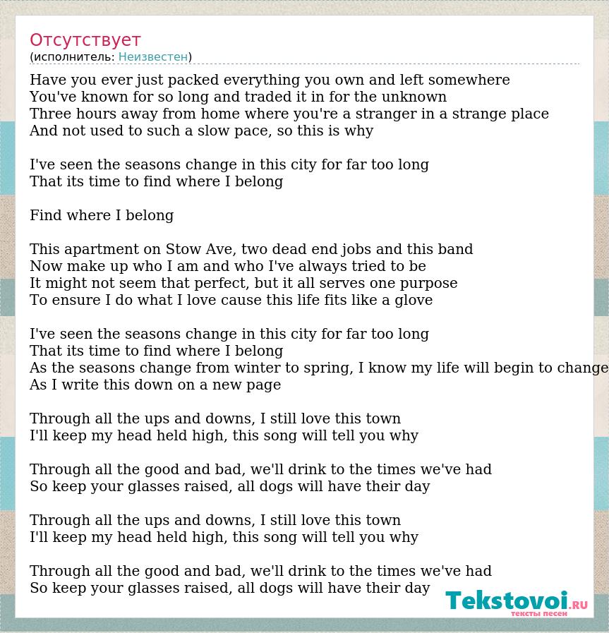 Have you ever just packed everything you own and left somewhere You've known for so long and traded it in for the unknown Three hours away from home where you're a stranger in a strange place And not used to such a slow pace, so this is why I've seen the seasons change in this city for far too long That its time to find where I belong Find where I belong This apartment on Stow Ave, two dead end jobs and this band Now make up who I am and who I've always tried to be It might not seem that perfect, but it all serves one purpose To ensure I do what I love cause this life fits like a glove I've seen the seasons change in this city for far too long That its time to find where I belong As the seasons change from winter to spring, I know my life will begin to change As I write this down on a new page Through all the ups and downs, I still love this town I'll keep my head held high, this song will tell you why Through all the good and bad, we'll drink to the times we've had So keep your glasses raised, all dogs will have their day Through all the ups and downs, I still love this town I'll keep my head held high, this song will tell you why Through all the good and bad, we'll drink to the times we've had So keep your glasses raised, all dogs will have their day